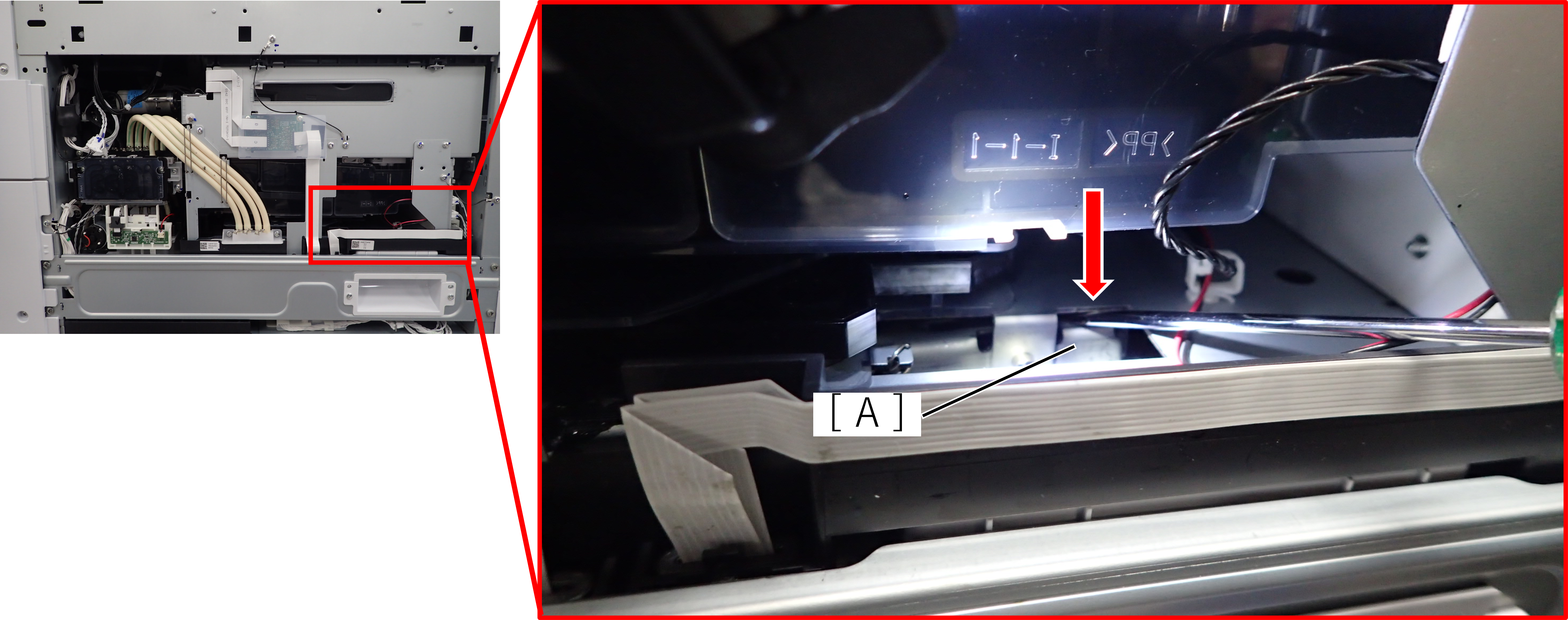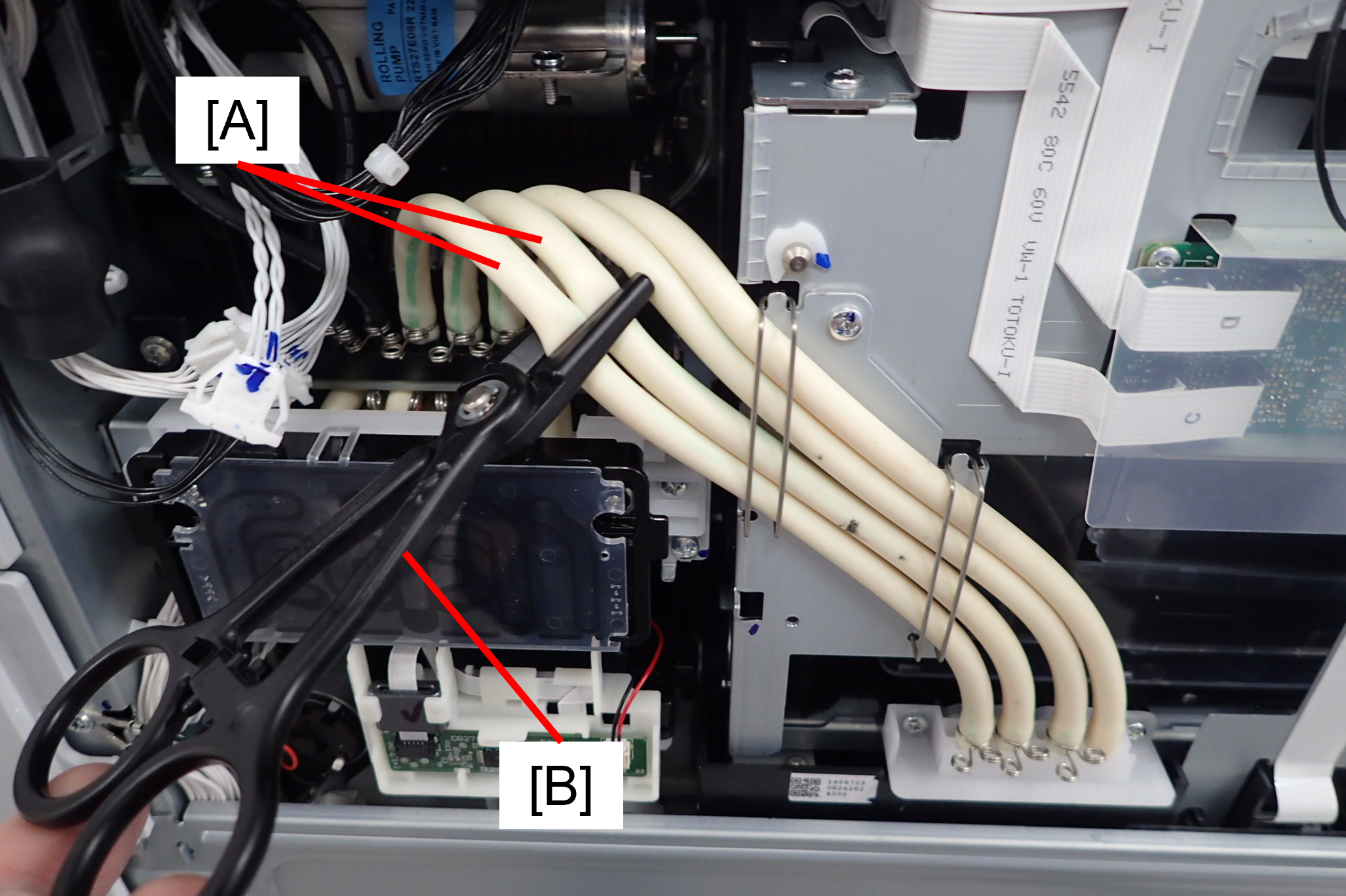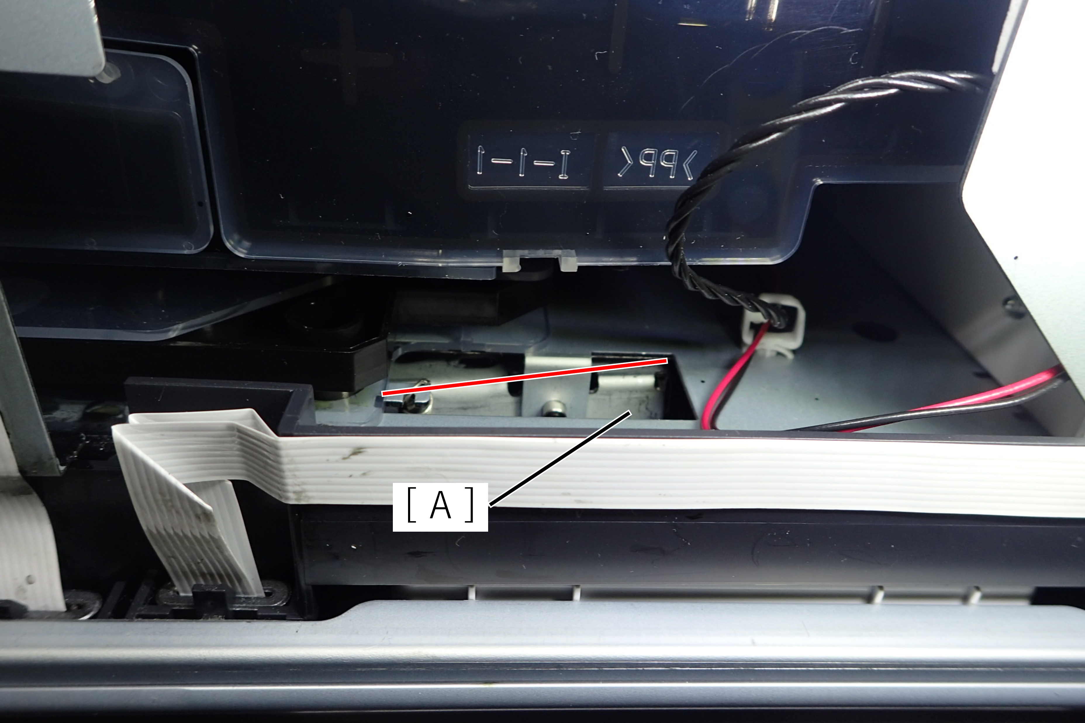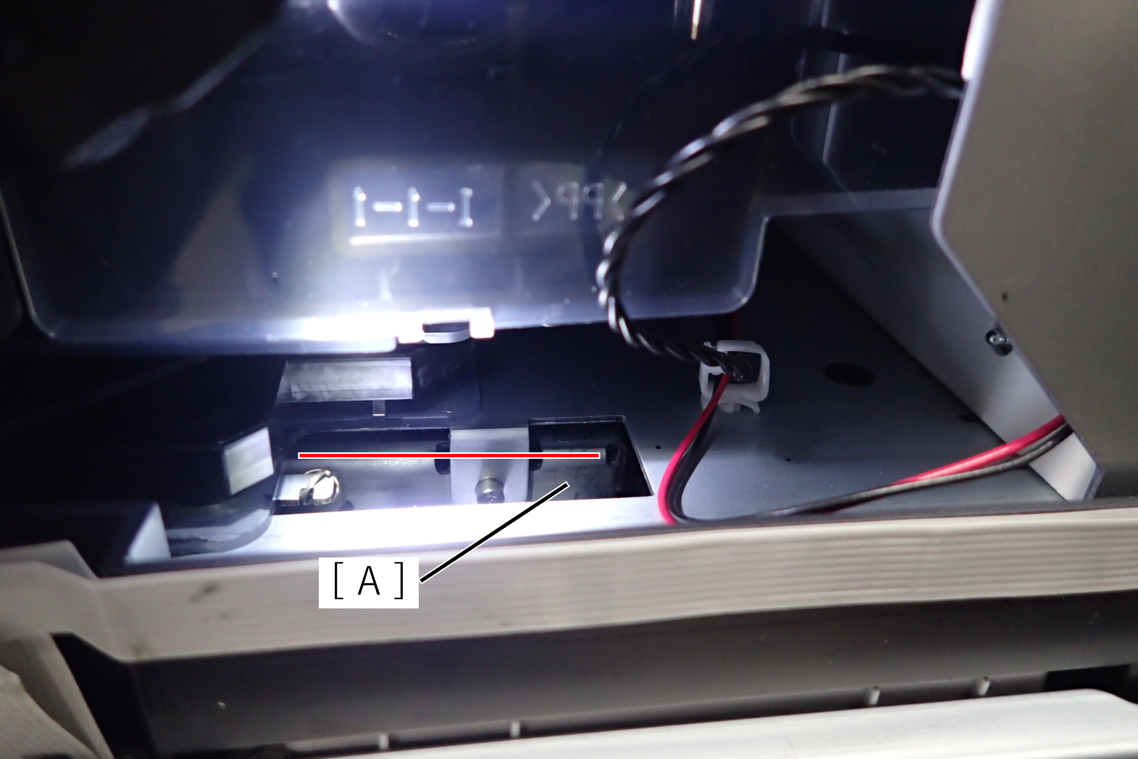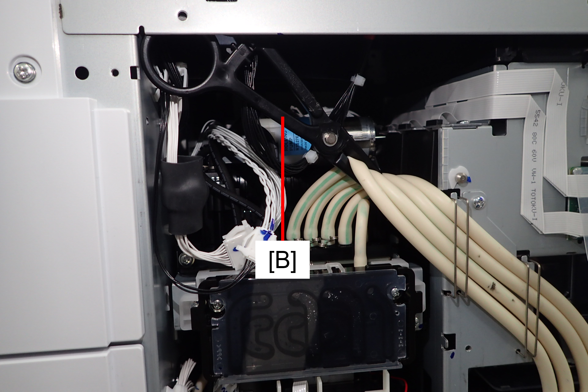 - 注意接线和内部机构,将管夹(B)放在机身金属板的背面。这样组装左盖时不会与管夹相互干扰。