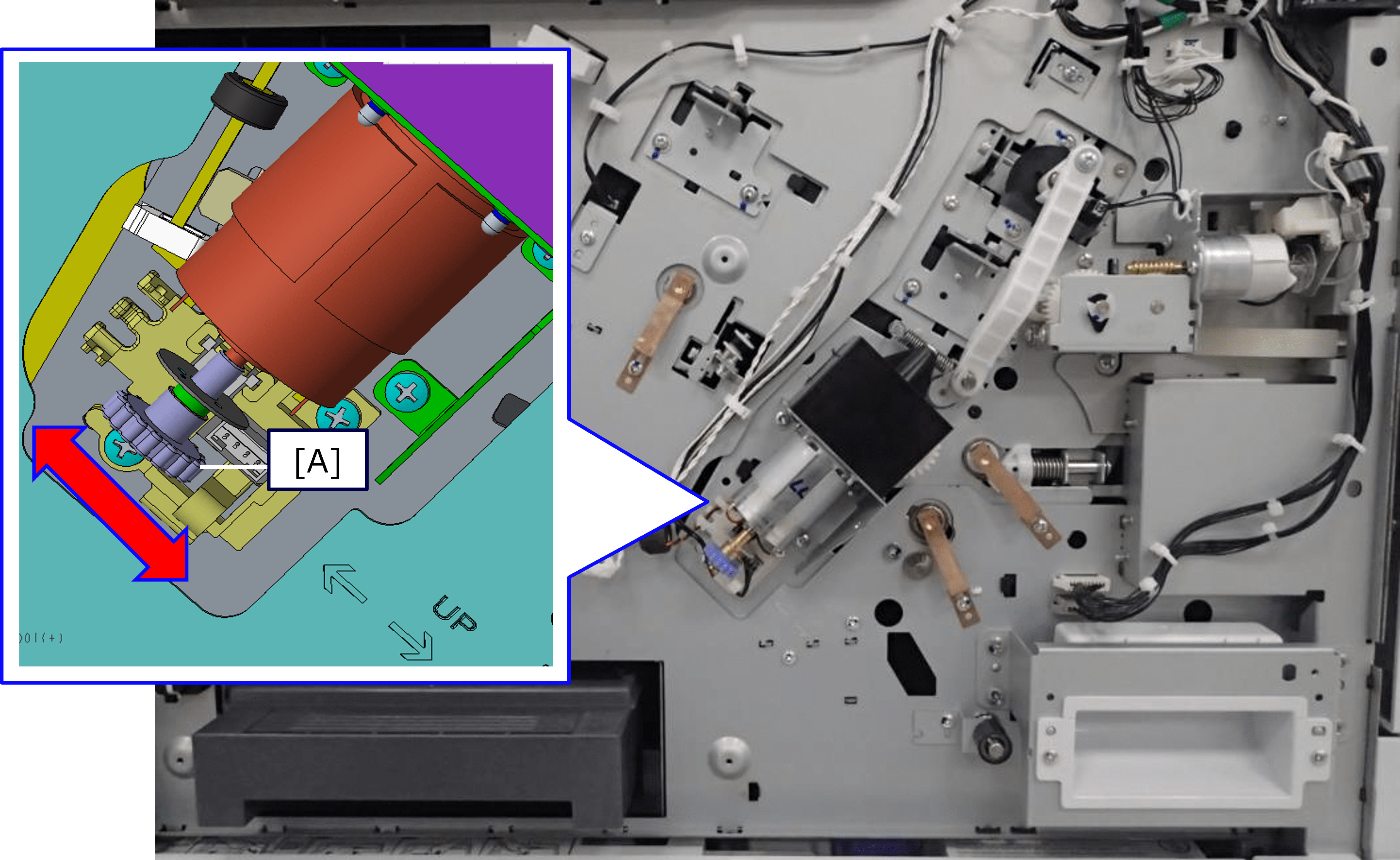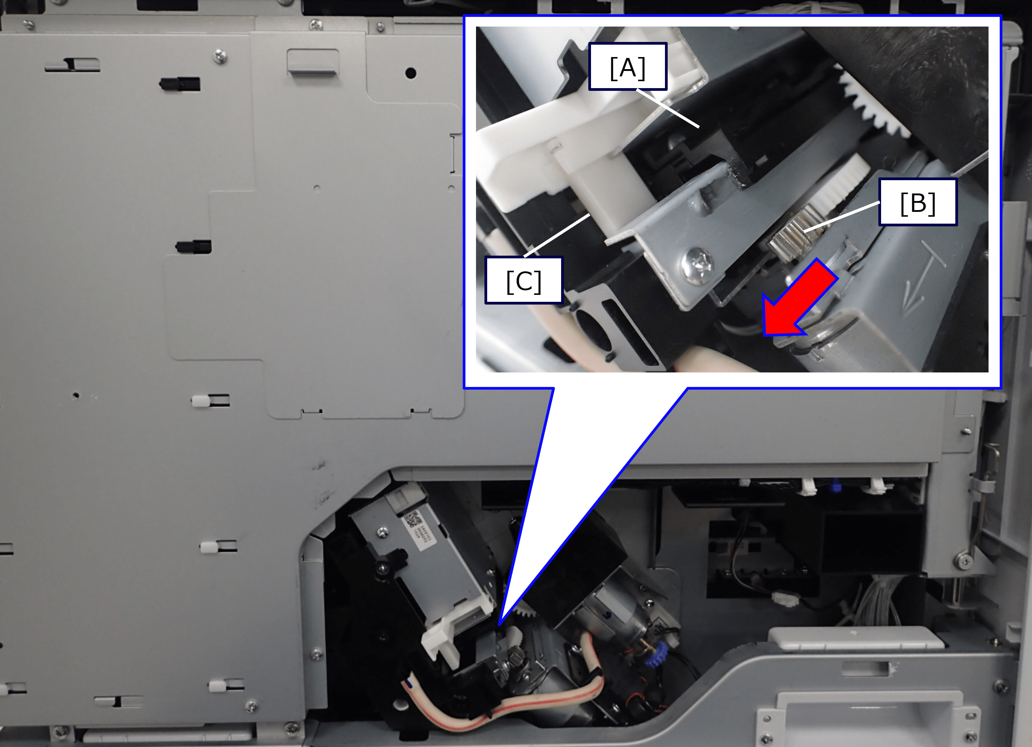 - 将清洁刮片组件(A)的驱动齿轮(B)向前转动,使清洁刮片组件从主体内部移到框架外侧。