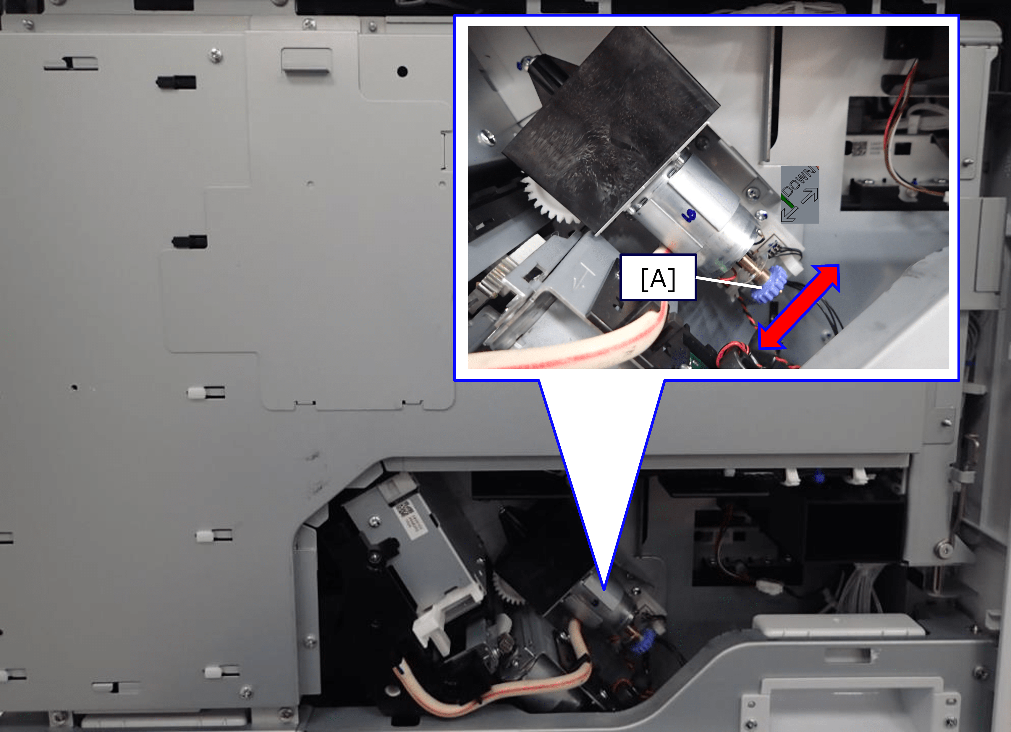 - 转动打印头驱动电机的刻度盘(A),改变打印头单元的位置。