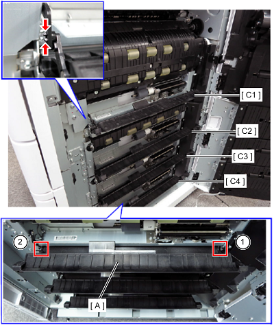 按数字顺序拆下两个定位销,然后拆下导纸轨内盖(A)。