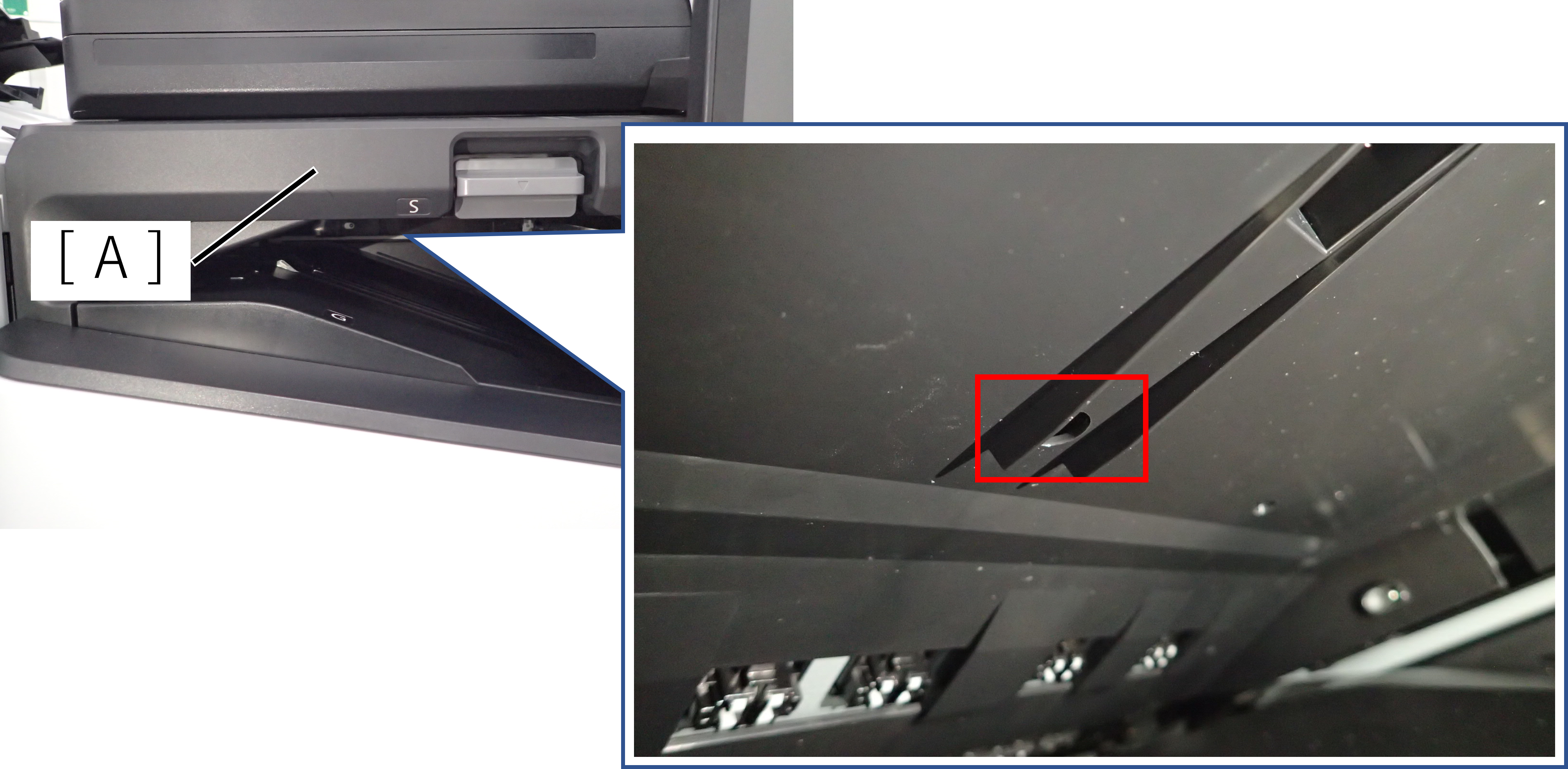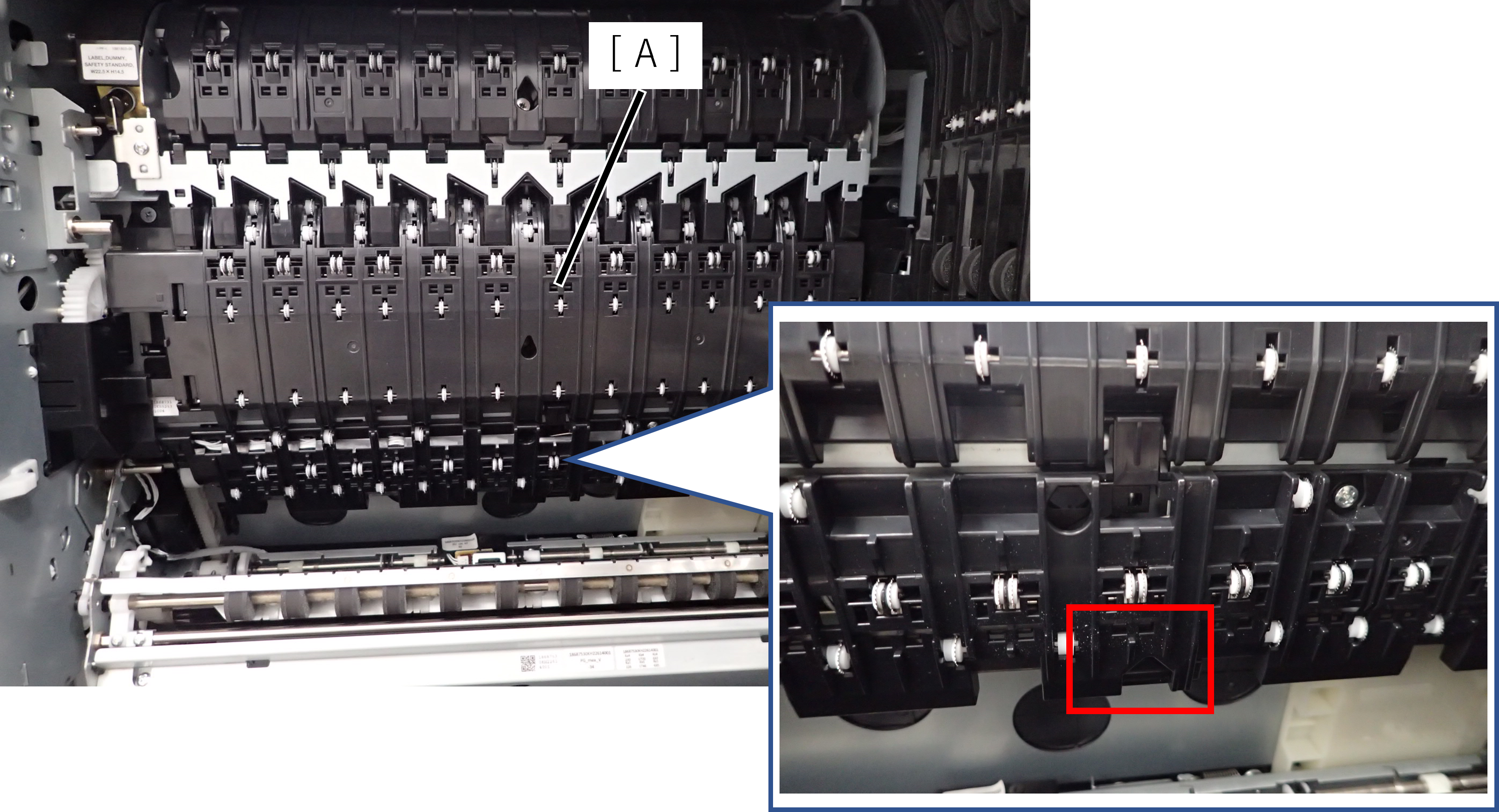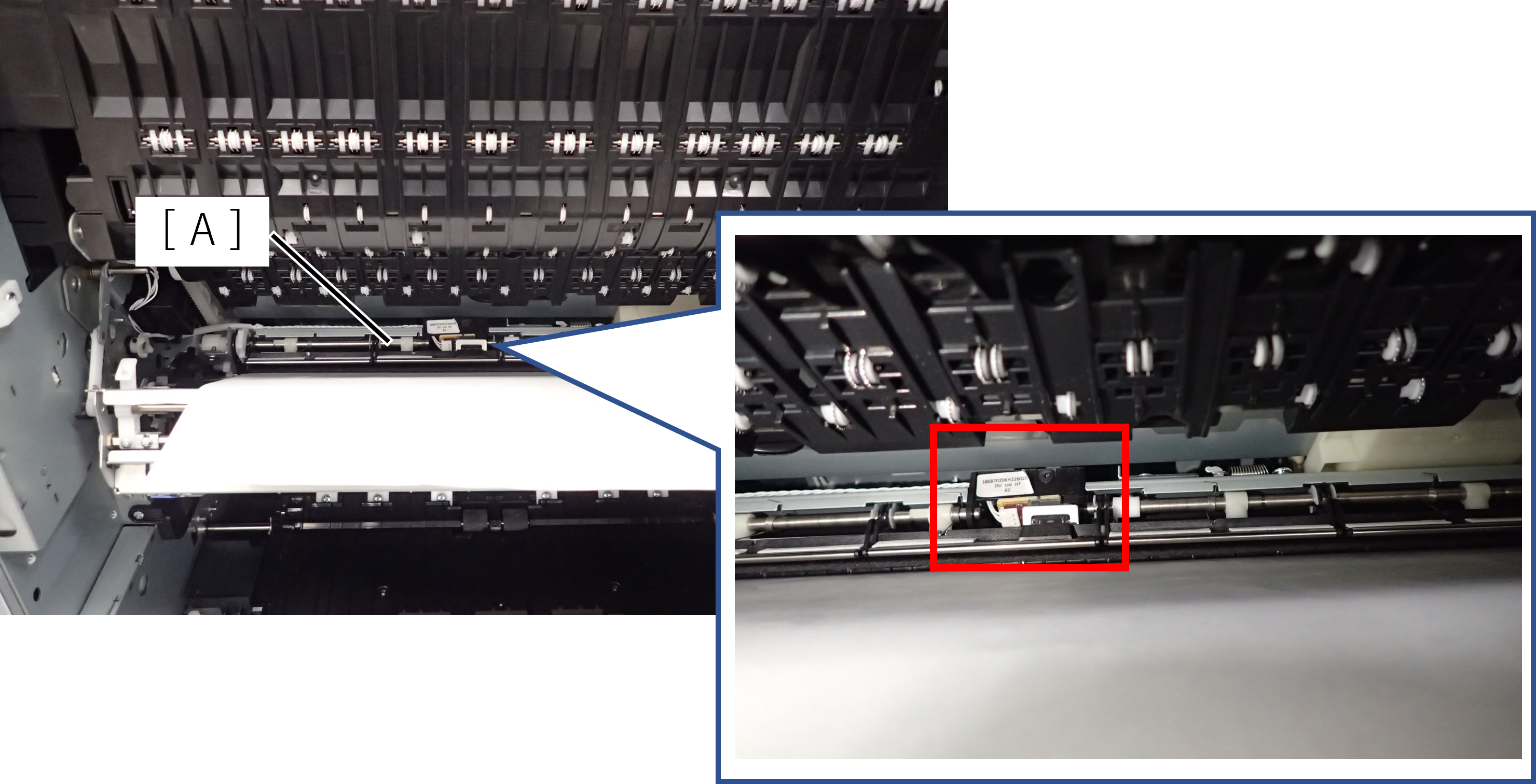 - 拆下2颗螺丝并拆下导纸轨(A)。