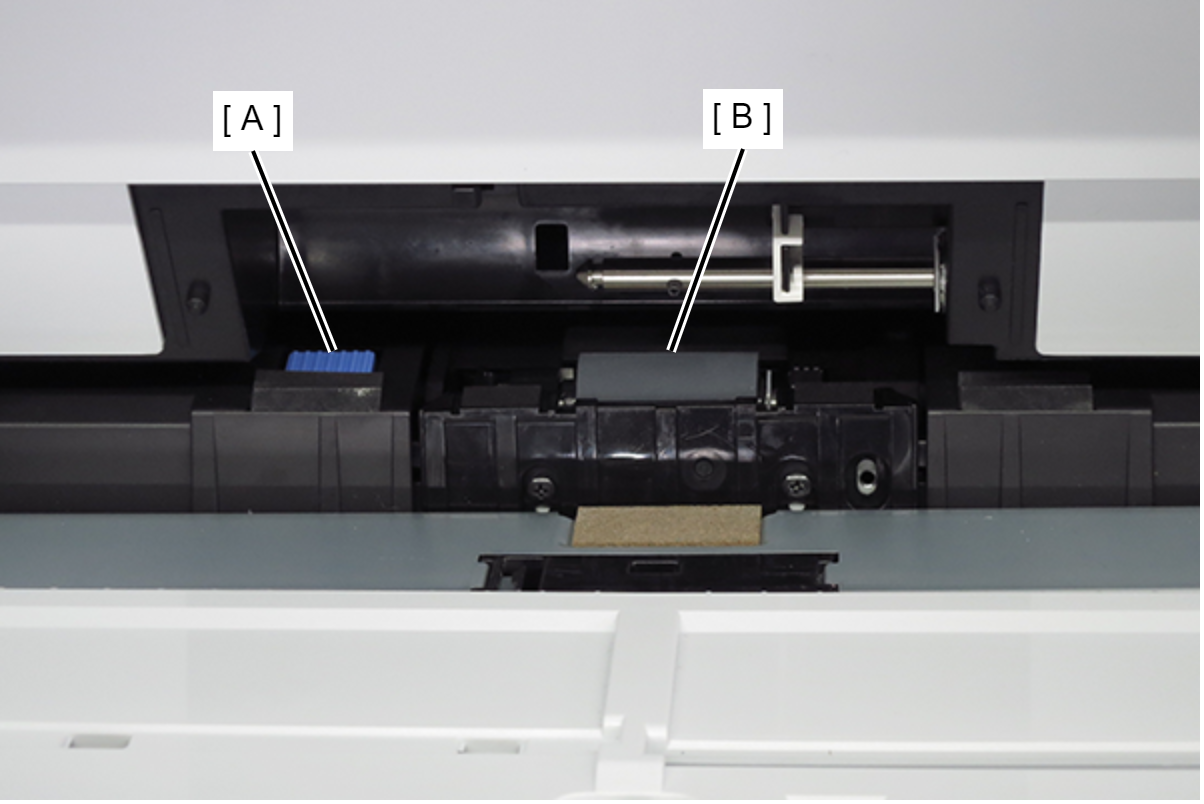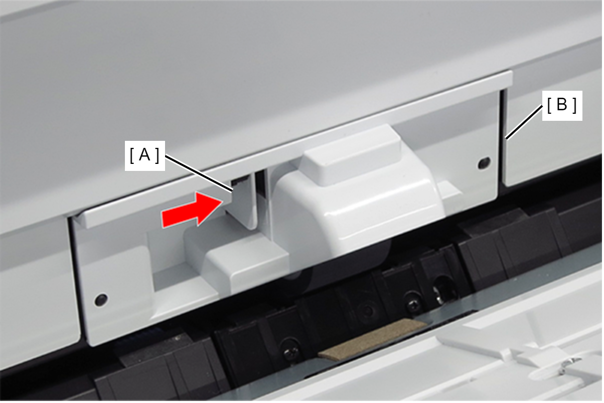 - 在推卡钩(A)的同时,拆下MP阻抗辊盖(B)。