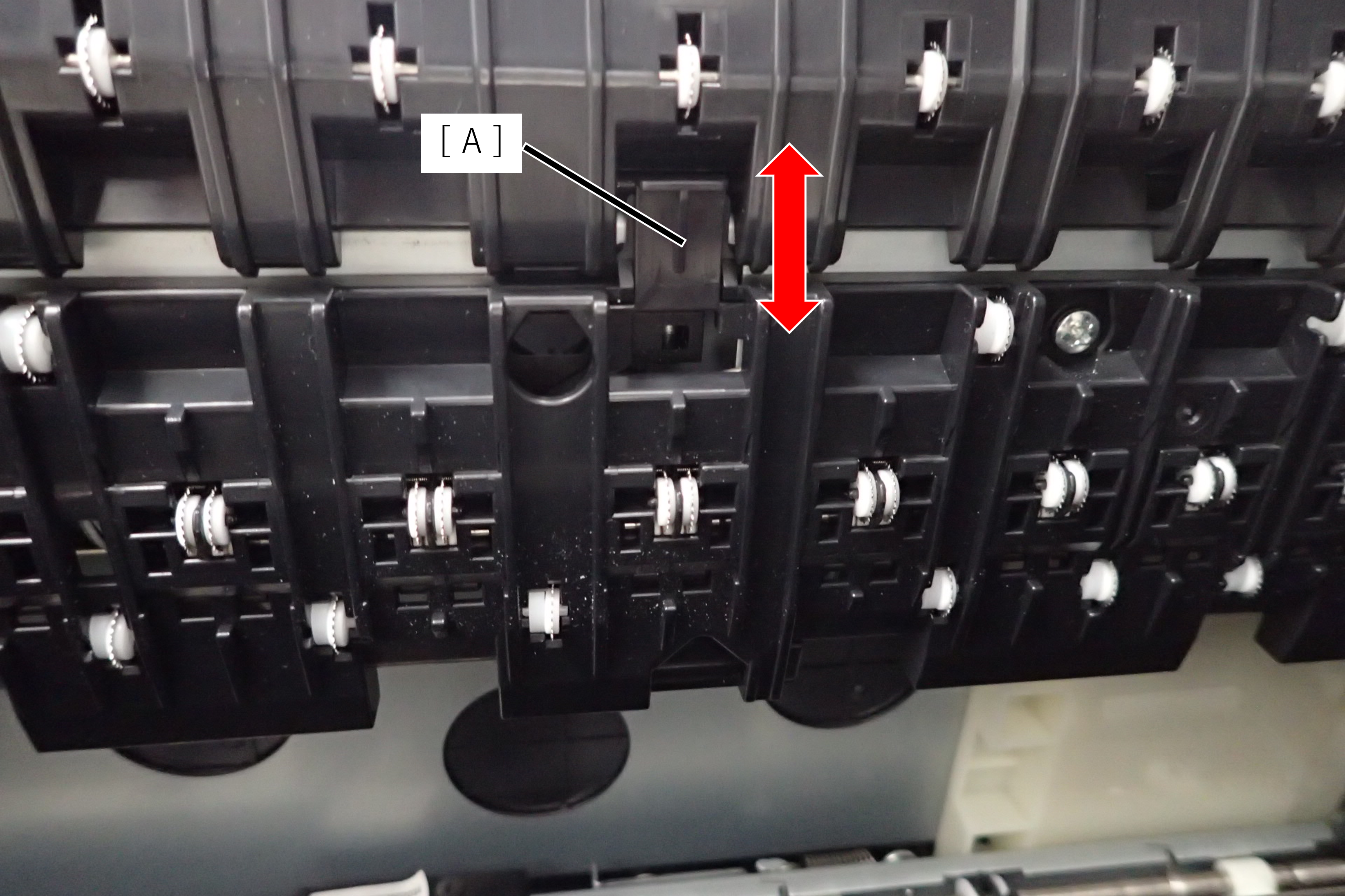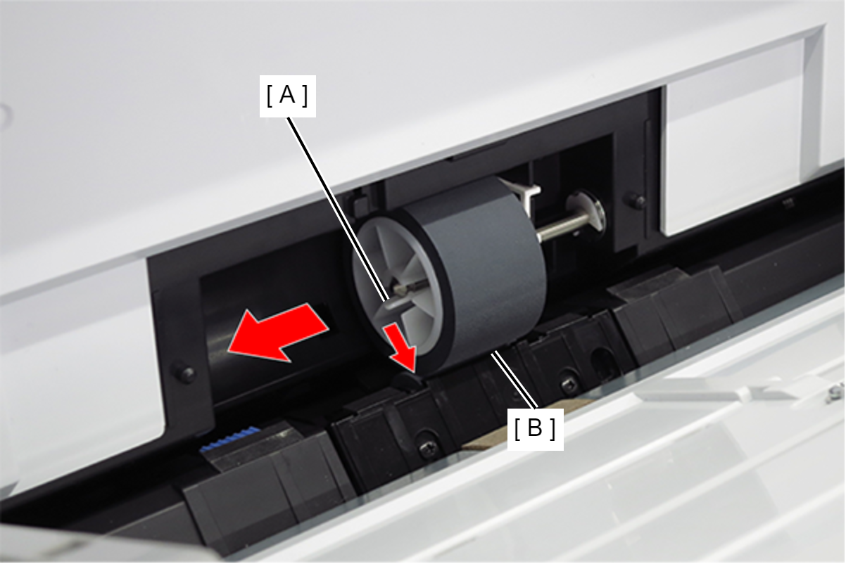 - 在弯曲卡钩(A)的同时,沿箭头方向拆下MP阻抗辊(B)。