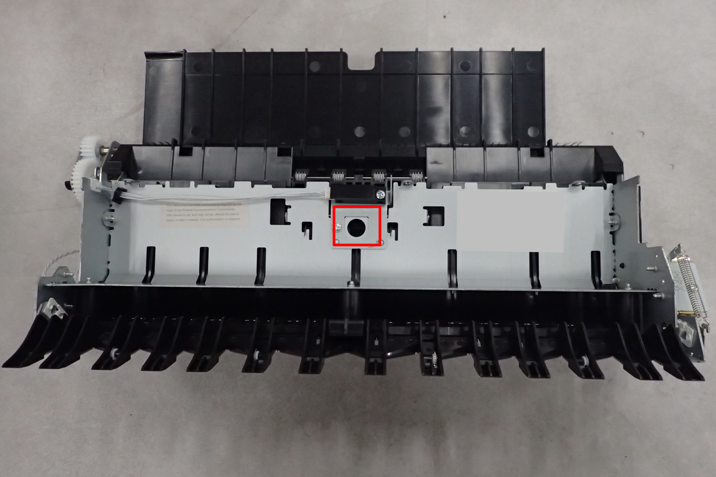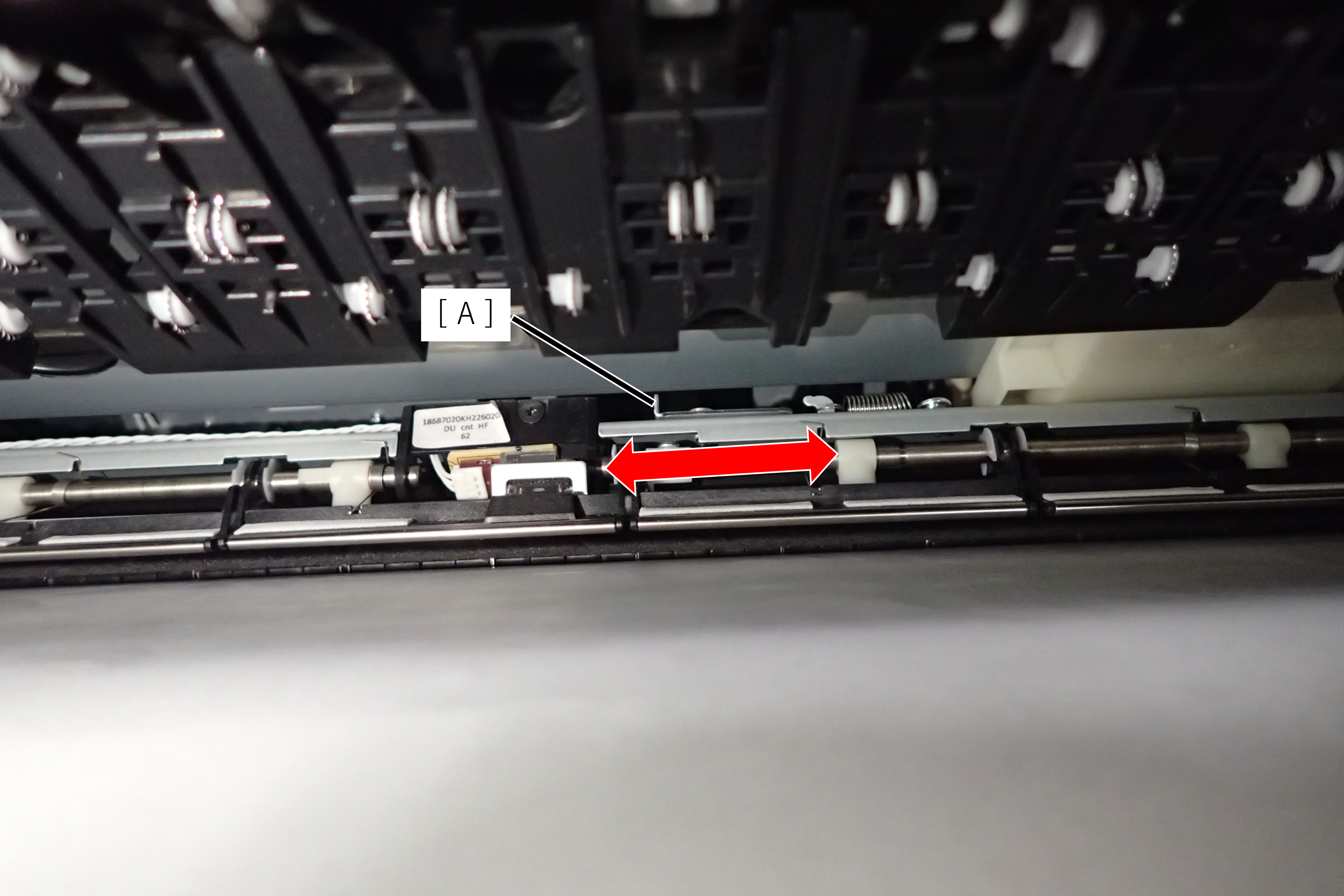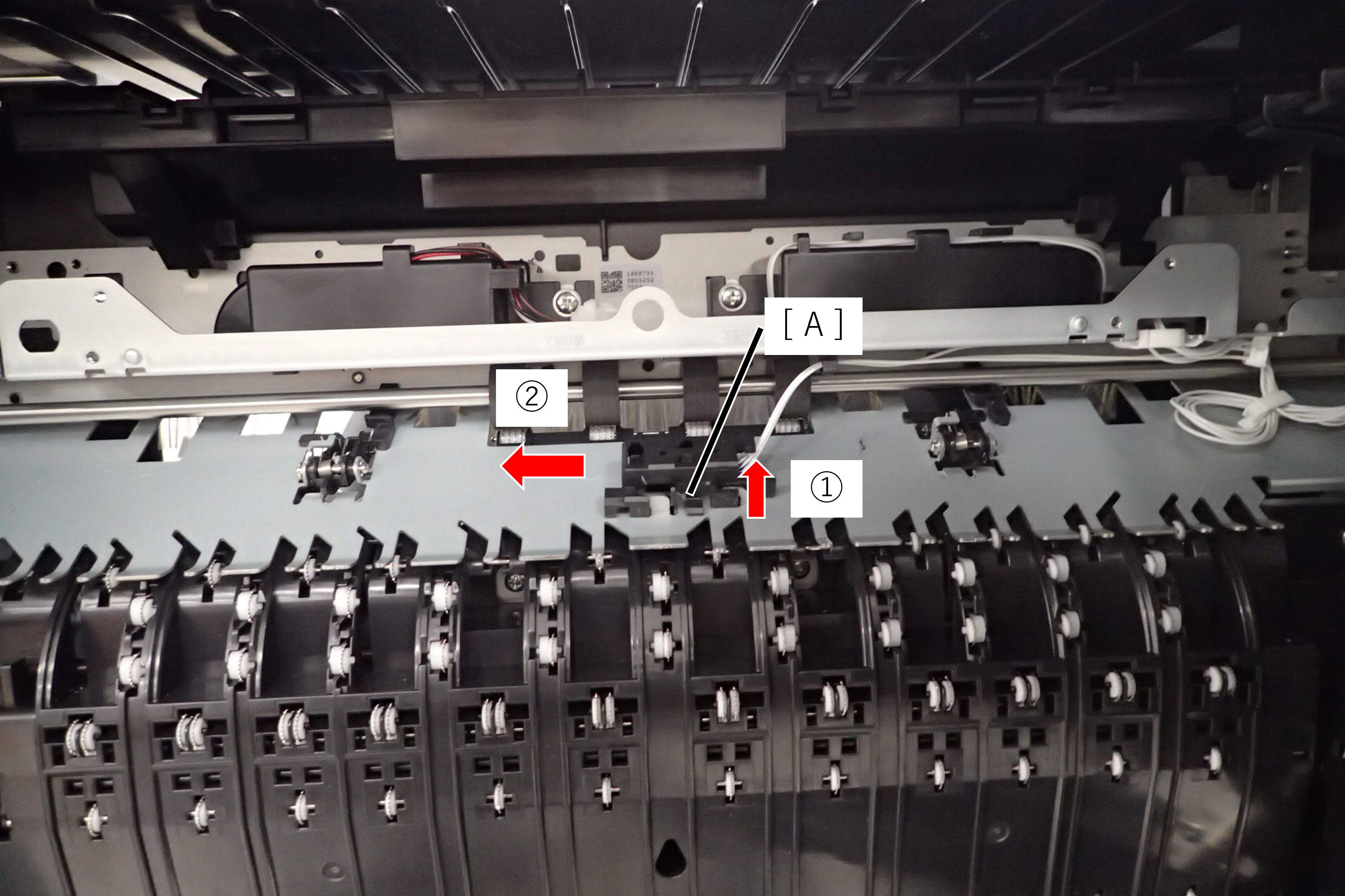 - 沿箭头方向(1)推第1出纸托盘预出纸传感器的杆(A),将其沿箭头方向(2)滑动,从金属板上拆下。