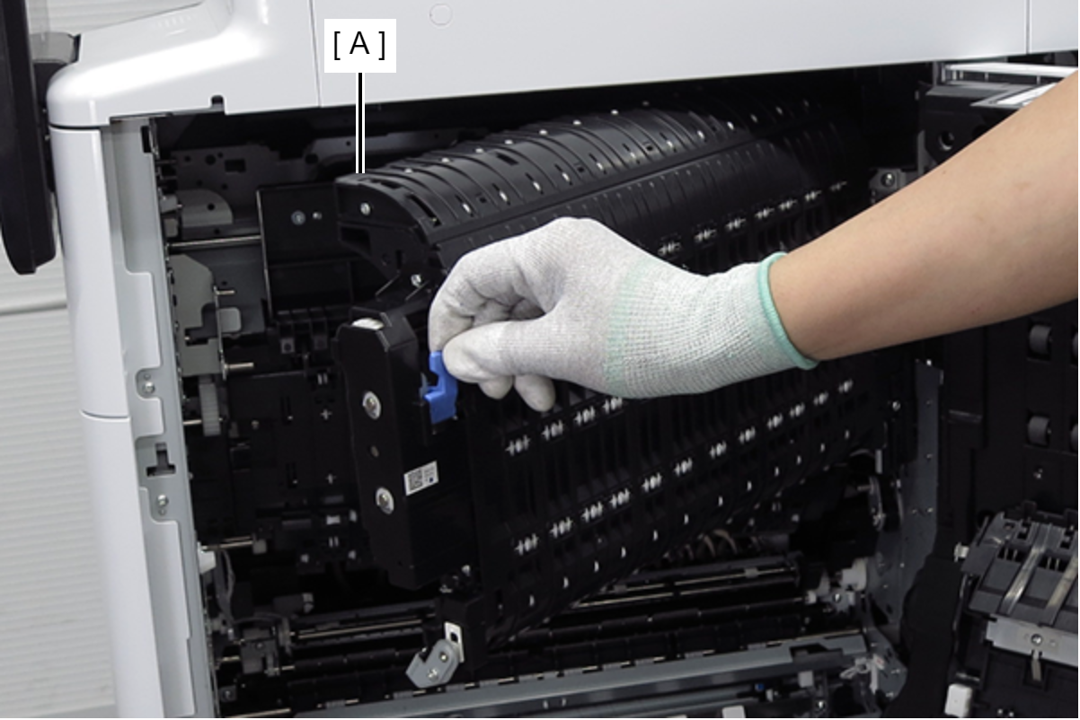 - 拉动控制杆(A),打开皮带单元(B)。