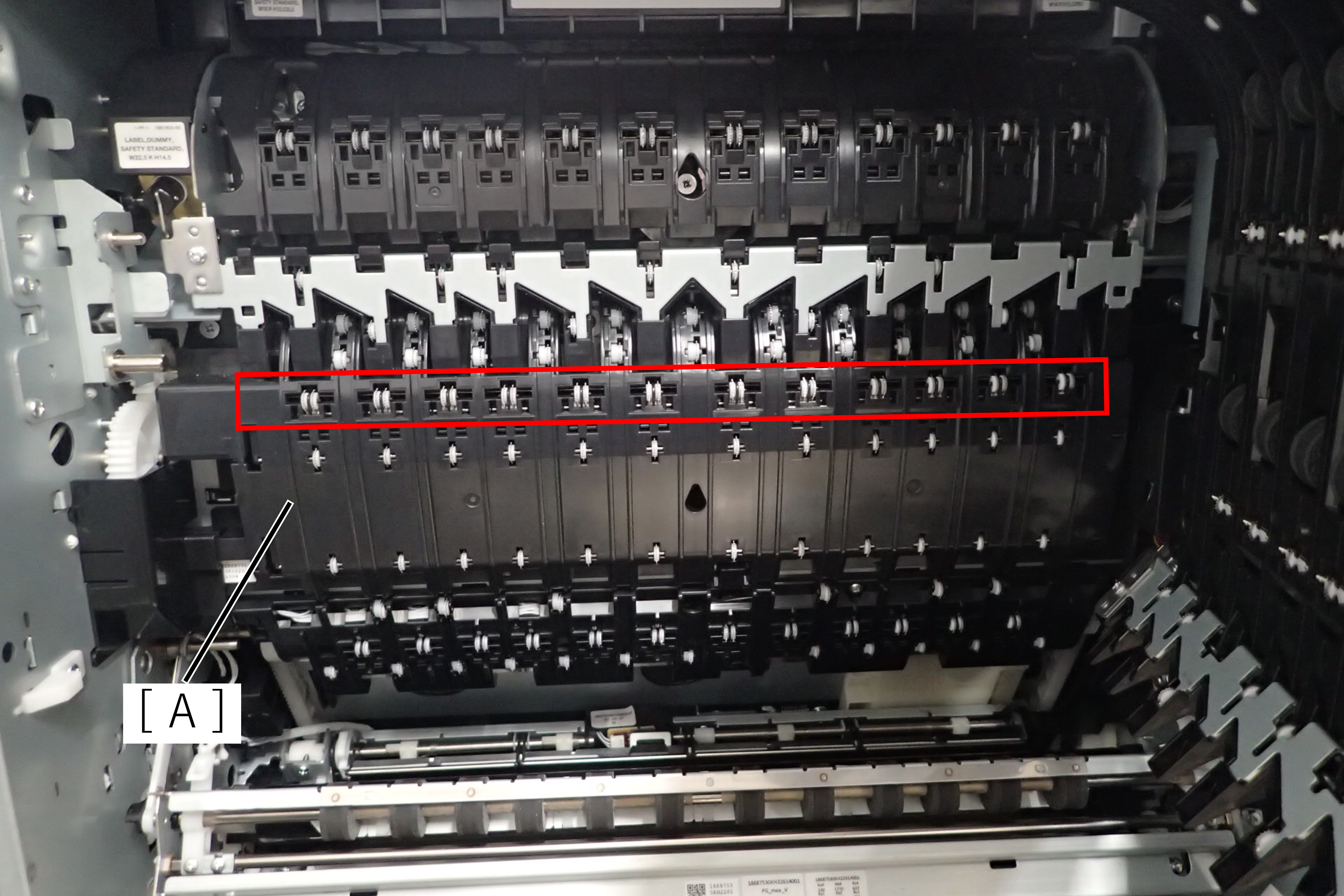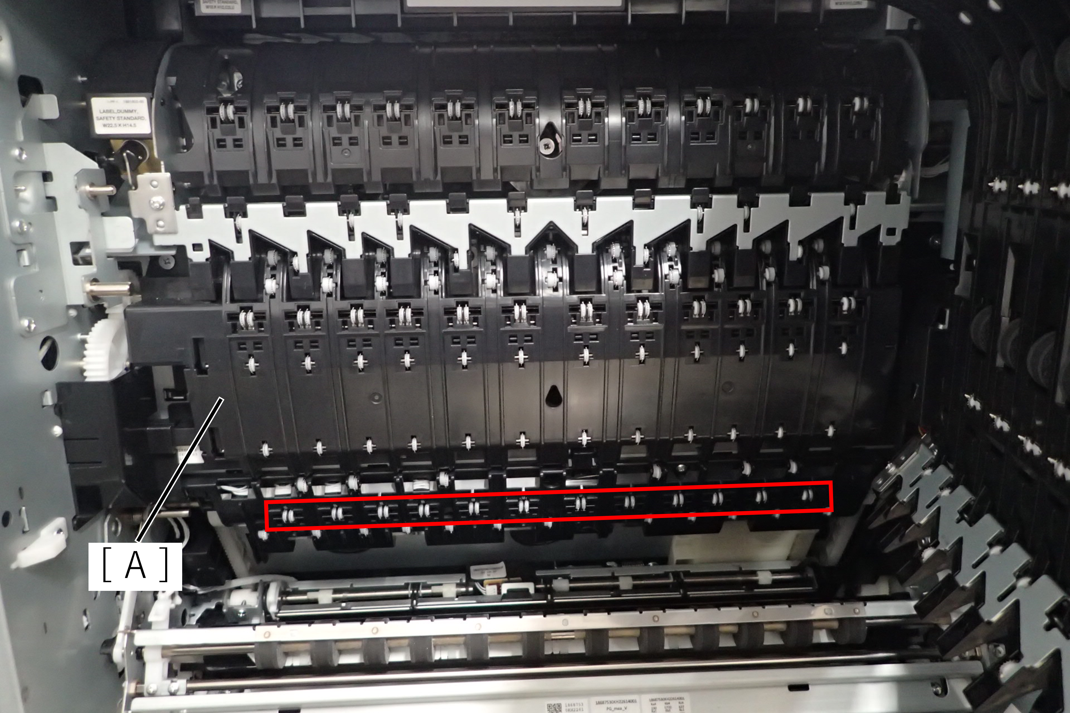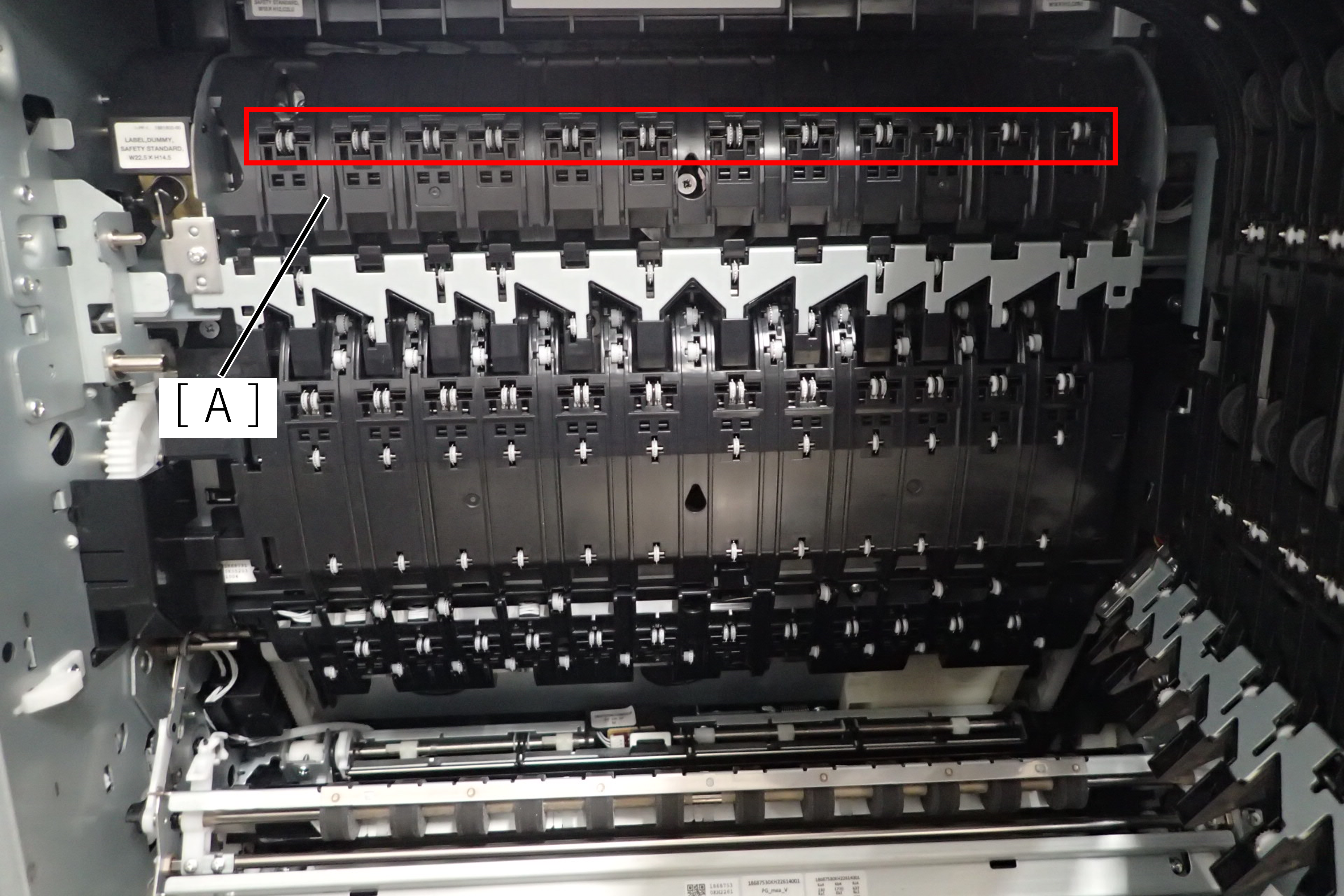 - 红框中的齿形辊在出纸路径(A)上。