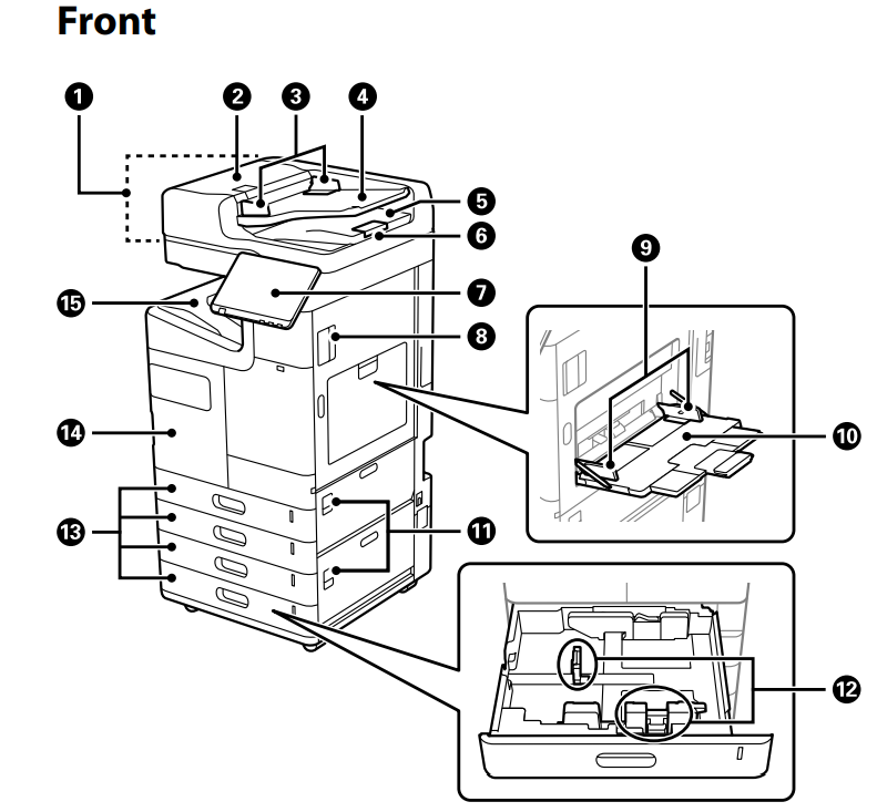 13 | 纸盒1、2、3、4(C1、C2、C3、C4) | 装入纸张。C3和C4为选件。 |