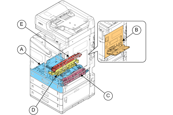 | B | 右门单元(手动进纸器) | 手动进纸器可送入特殊纸等厚纸(信封、明信片等),这些纸张无法从纸盒送入。单元内安装有两种辊和纸张大小检测传感器,进行进纸准备。 |