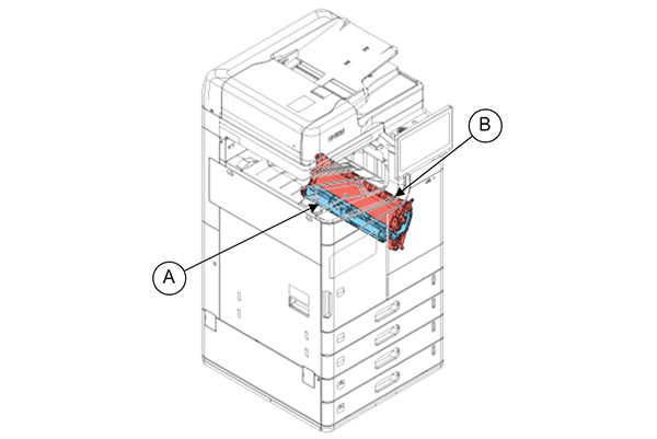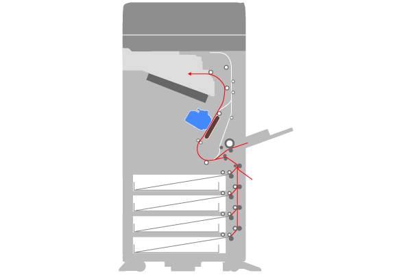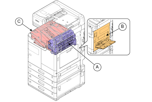 本产品的右侧有纸张传输路径。由于能在产品右侧清除卡纸,所以产品左侧的安装空间可以尽量小。在标准型号中,供纸口可以使用纸盒C1/C2和手动进纸器,并可通过安装可选的新增纸盒(C3/C4)和大容量进纸器来扩大进纸口。在标准型号中,出纸口可以使用面朝下托盘,并可通过安装可选的内部托盘、落地式装订器和内部装订器来扩大出纸口。