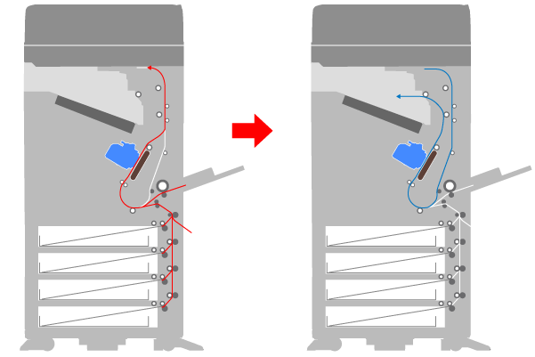 单面打印的纸张被传输到双面路径。纸张在双面路径中被切换回,打印面翻转。之后被再次传输到纸张路径,执行双面打印。