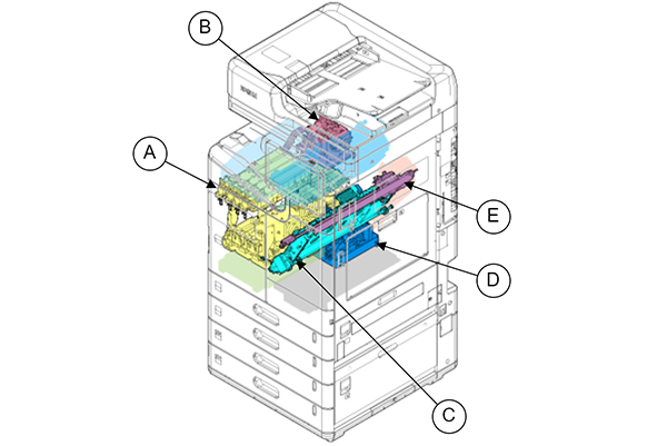 | D | 维护单元 | 通过驱动空气泵使废墨通道减压,将废墨转移到维护箱。此外还有增湿液储箱,增湿液剩余量由箱内的传感器管理。 |