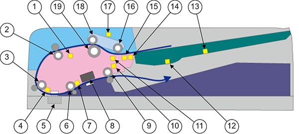 在对位辊停止时装入/送入纸张。纸张达到对位辊后,这些状态会保持一定时间,使纸张在歪斜校正过程中弯曲。