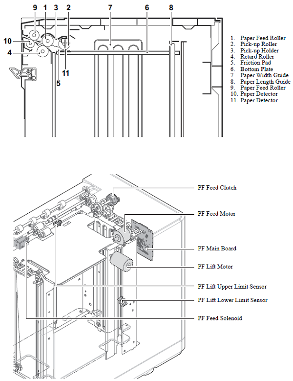 通过三种辊对放置的纸张执行进纸操作。阻抗辊逐张分离纸张以防双进纸。各辊通过PF进纸离合器驱动PF电机。