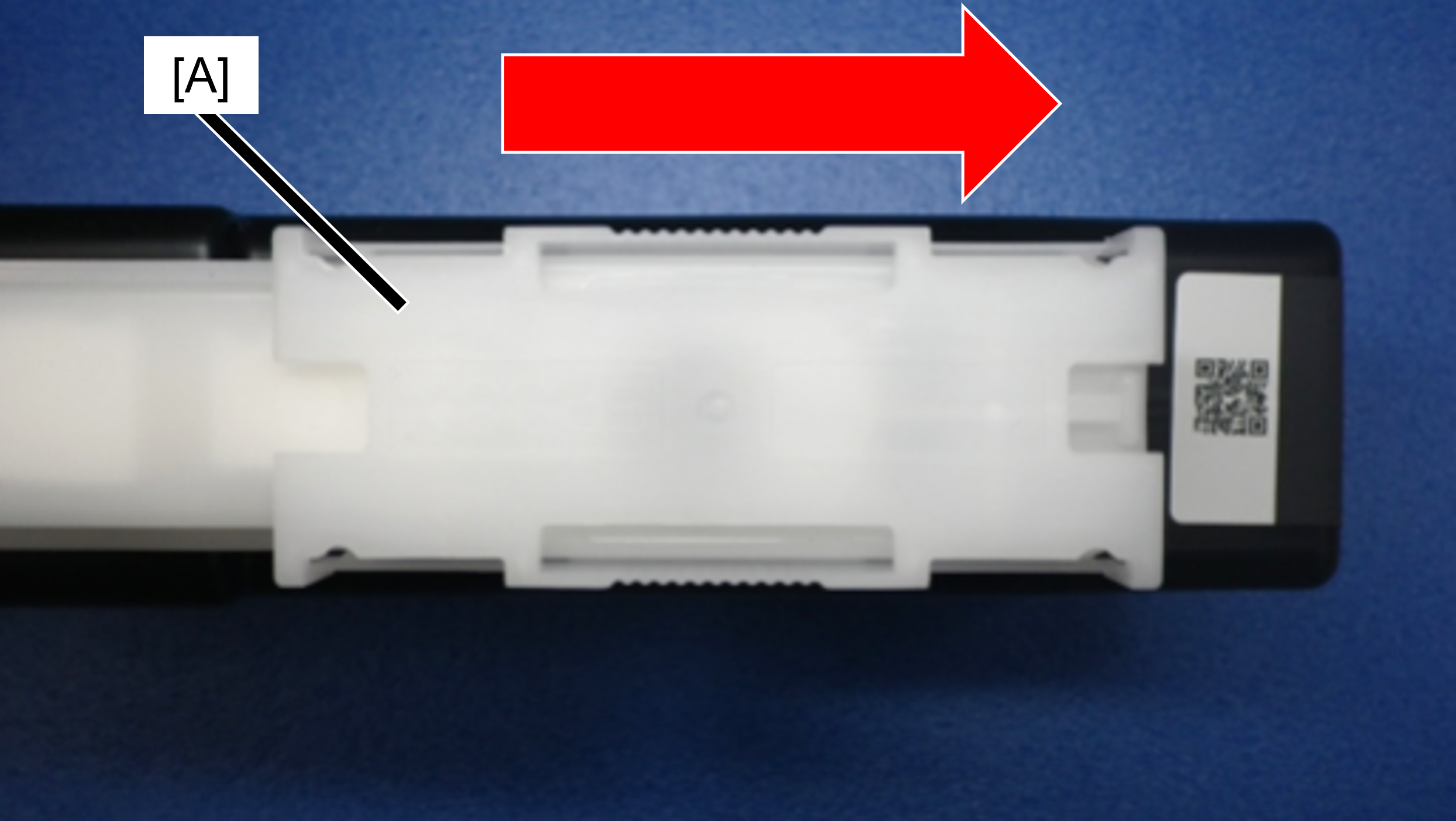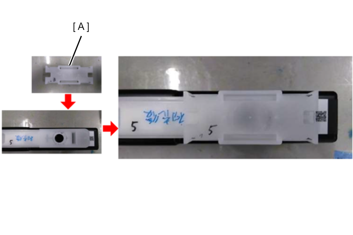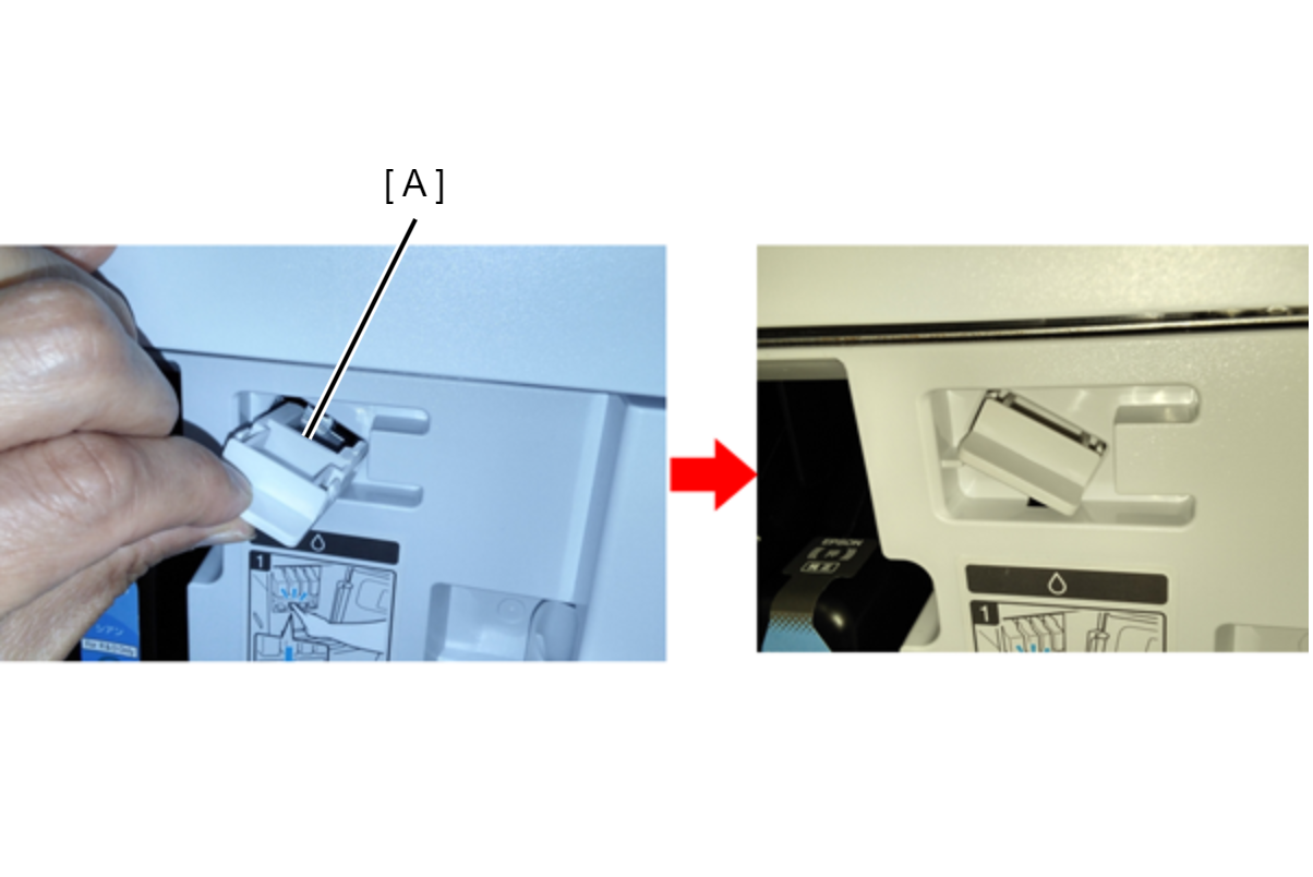 如何安装供墨口盖 沿箭头方向滑动供墨口盖(A),直至发出咔哒声。 供墨口盖的形状两面对称,所以可以按任一方向安装。