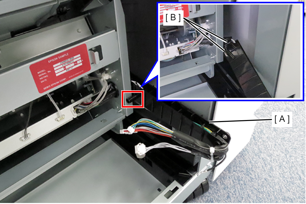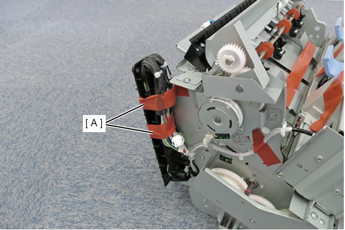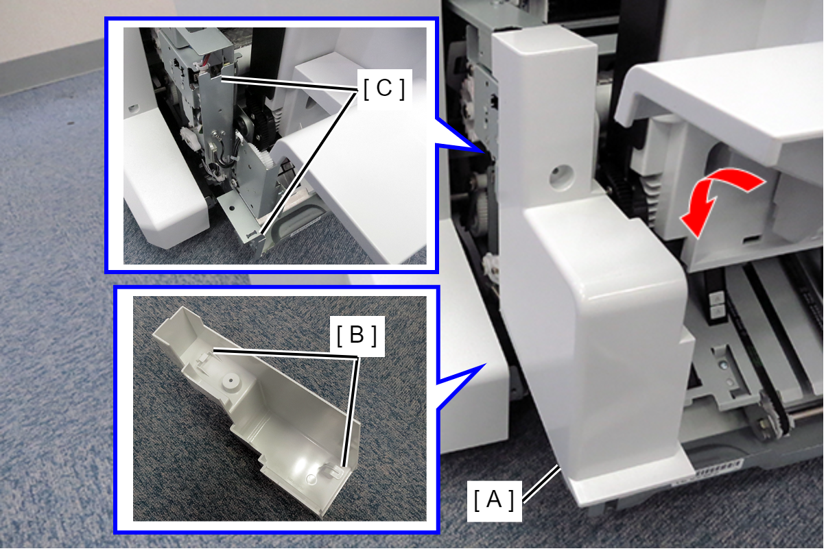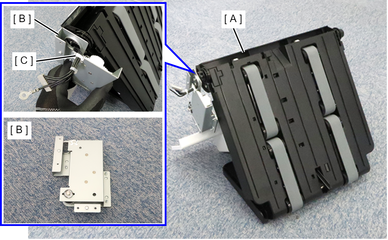 - 将鞍式装订托盘单元(A)的电缆穿过后托盘支架(B)的孔,然后用卡箍(C)固定。