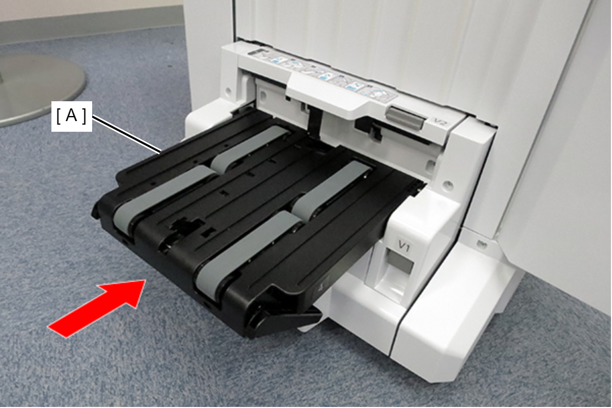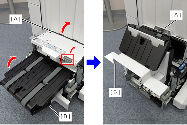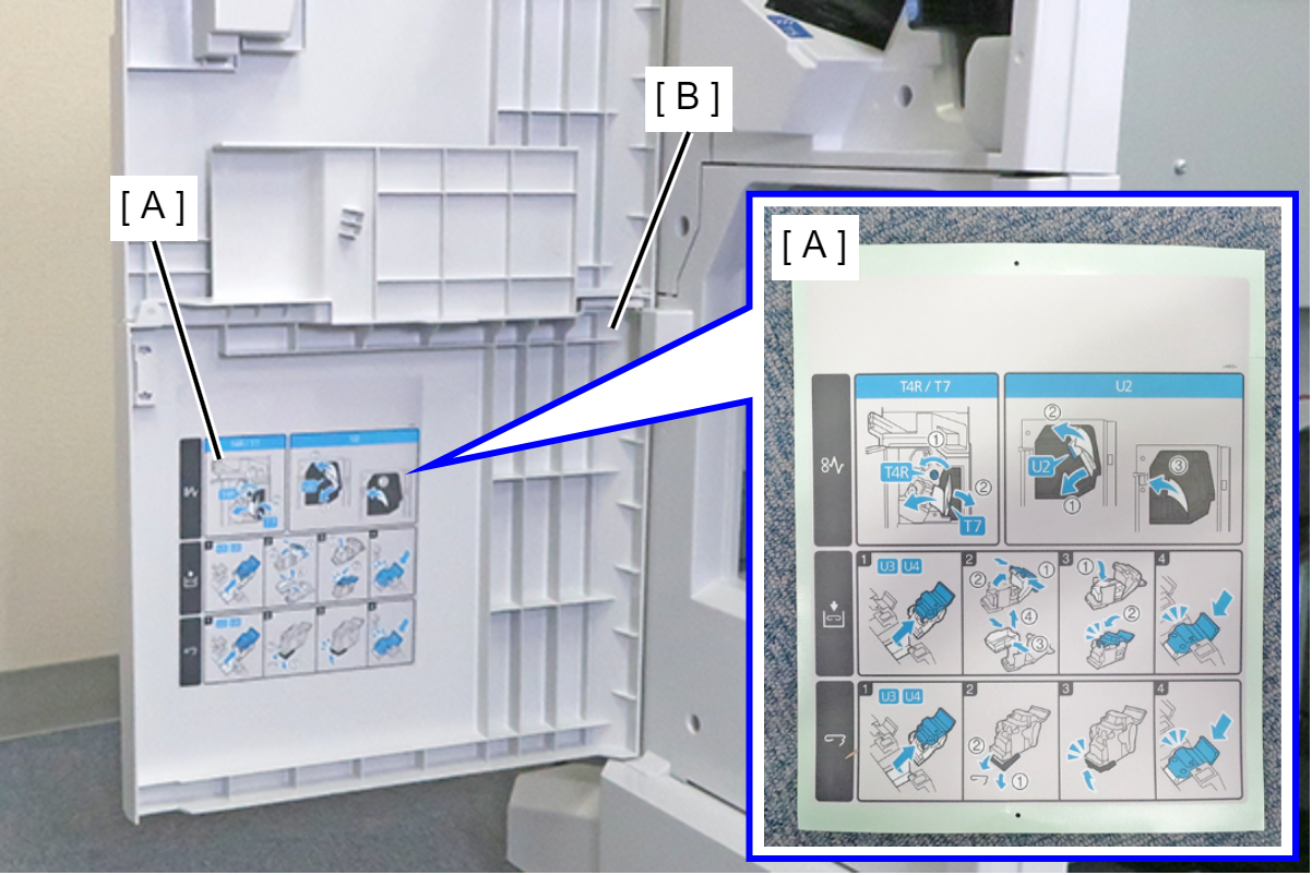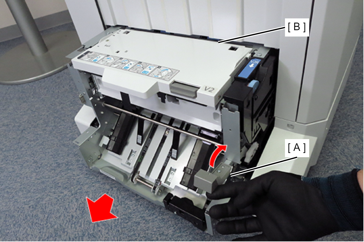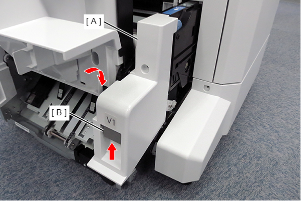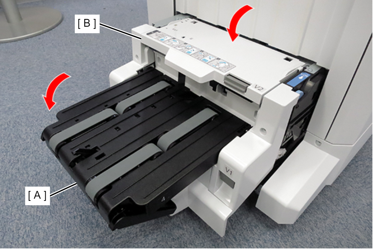 - 降下鞍式装订托盘单元(A),降下V2盖(B)。
