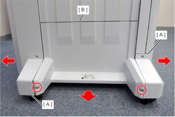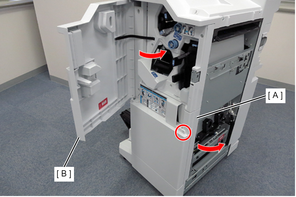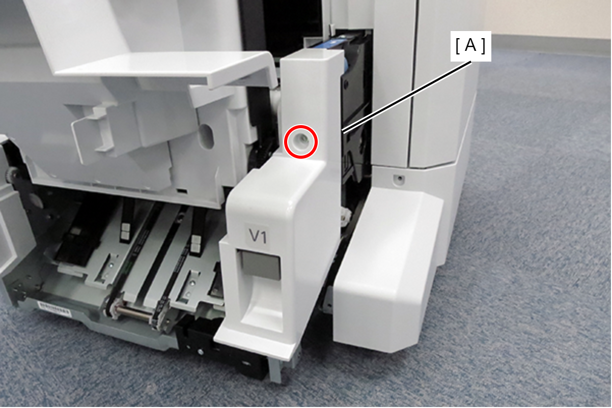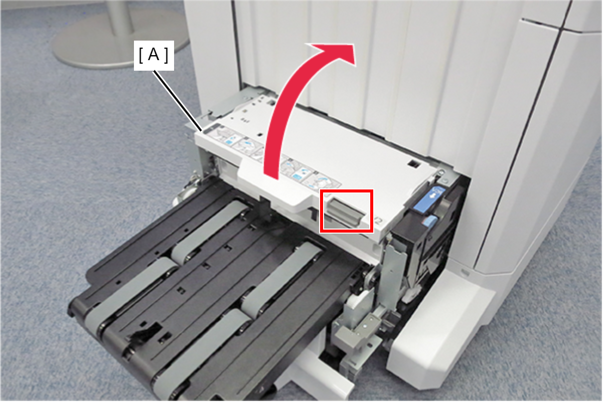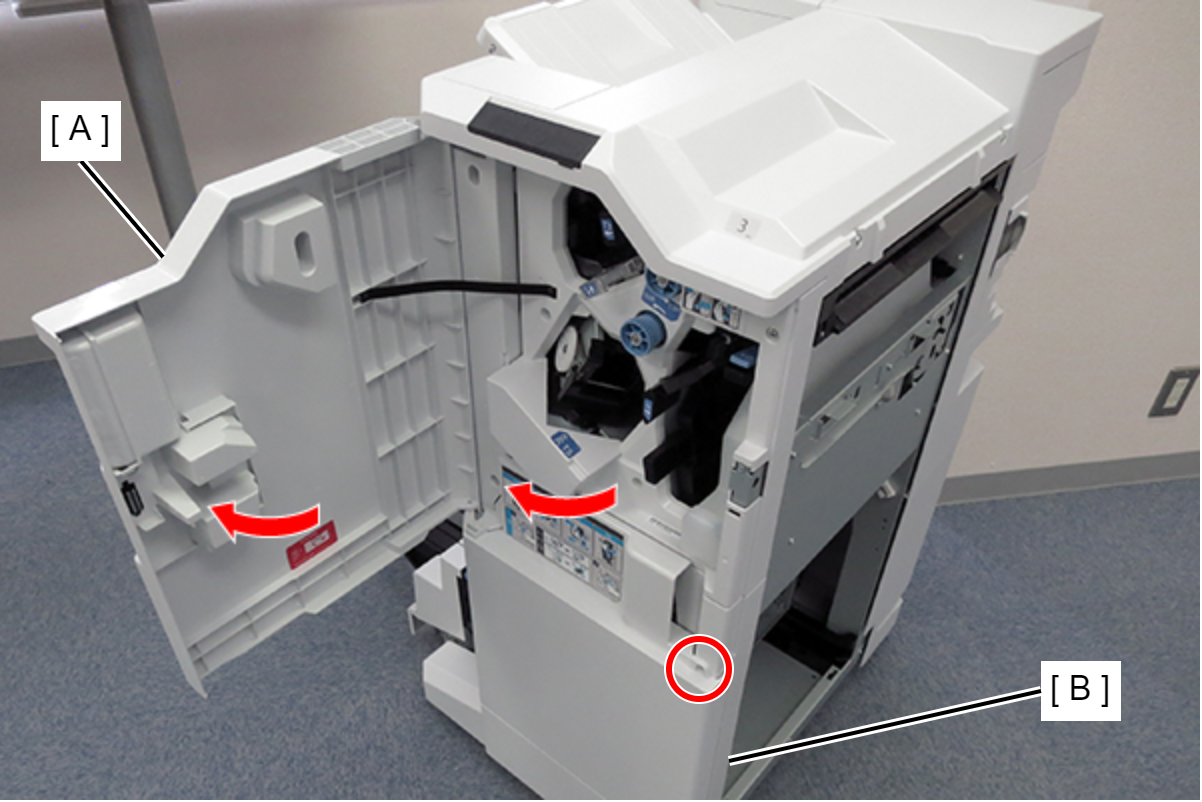 - 降下鞍式装订托盘单元(A),降下V2盖(B)。