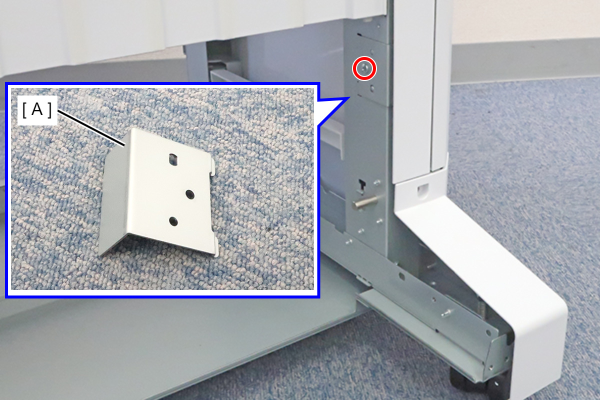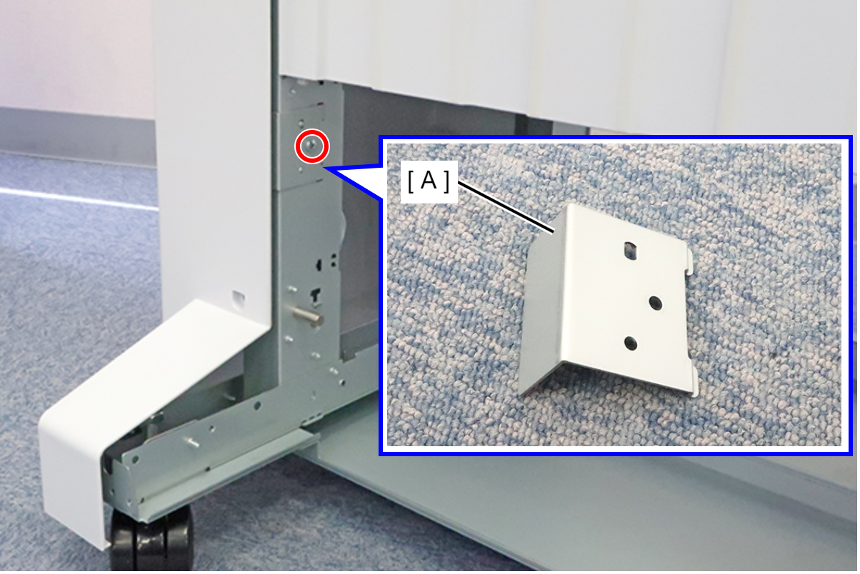 - 将后托盘支架上的2个定位销对齐落地式装订器(A)上的2个孔,然后用4颗螺丝固定后托盘支架(B)。