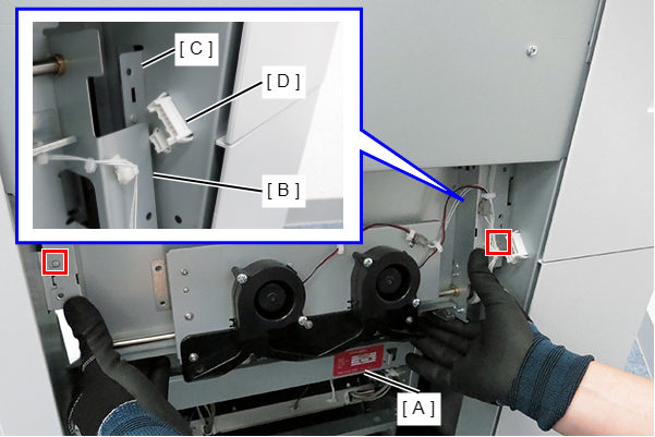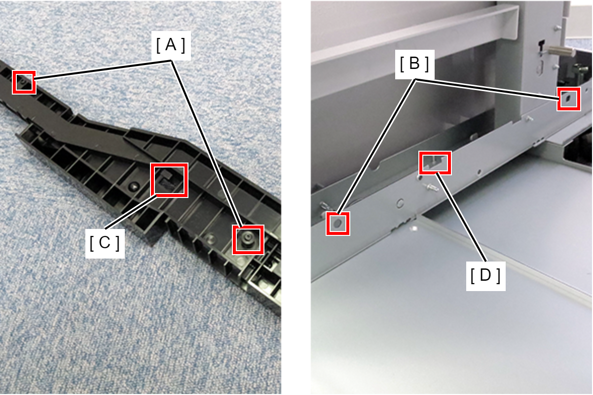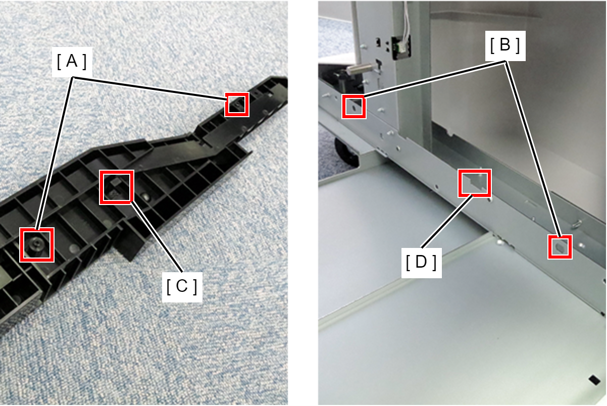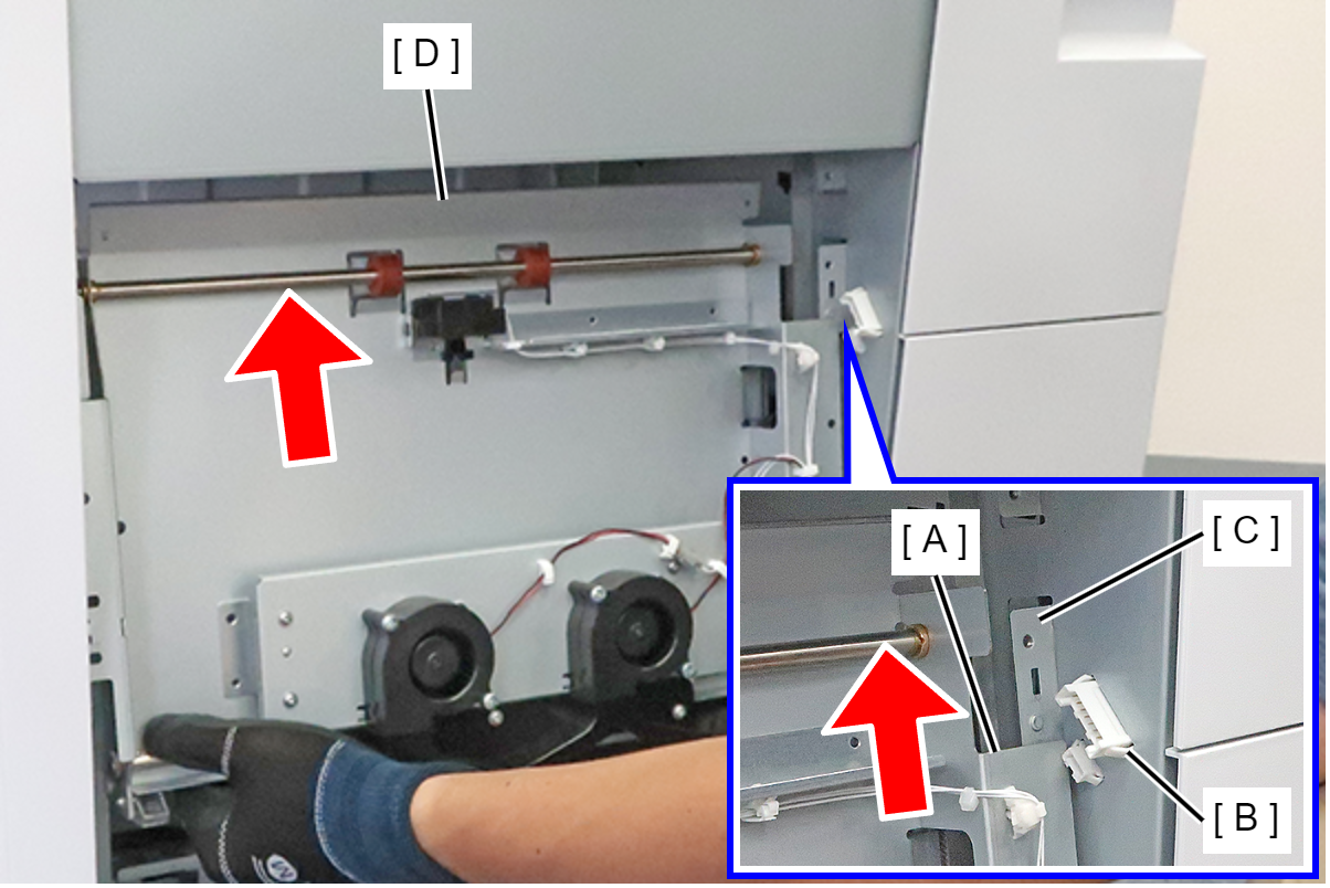 - 将鞍式装订单元前侧的框架(A)从连接器(B)和安装板(C)之间穿过,然后提起鞍式装订传输单元(D)。