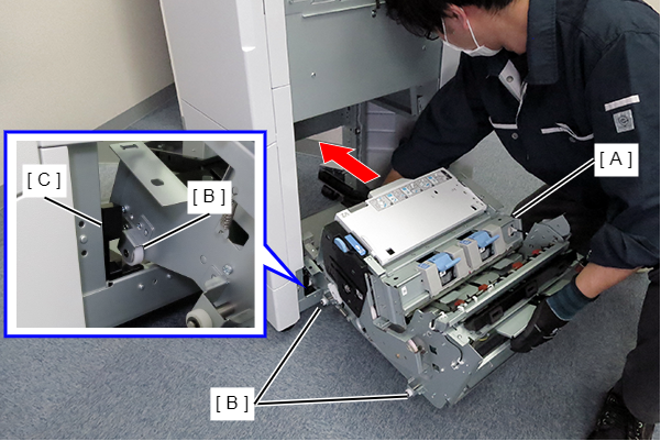 将鞍式装订单元(A)前侧和后侧的3个辊(B)放在前轨和后轨(C)上,然后将其向内推到底。