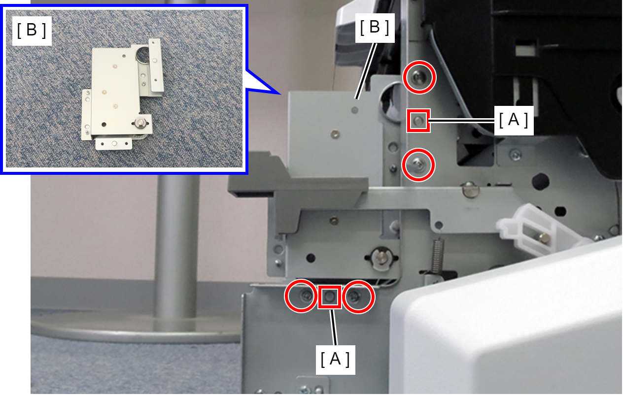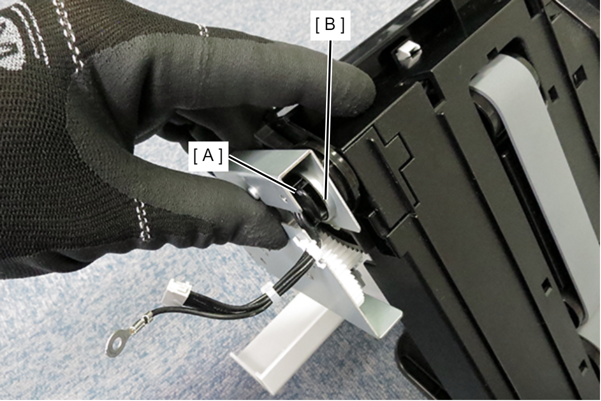 - 将鞍式装订托盘单元的环部分(A)插入后托盘支架的孔(B)中,使其临时固定。