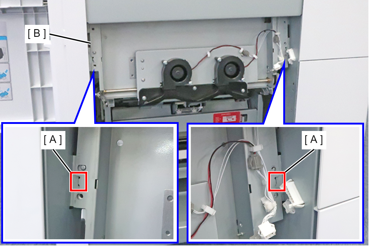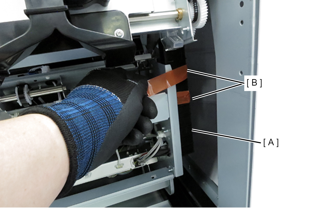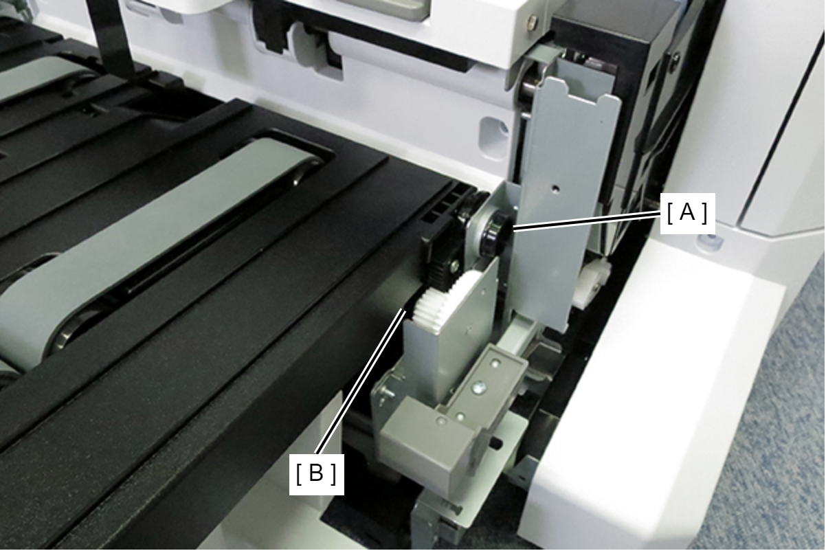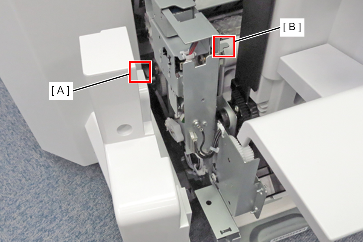 - 钩住鞍式装订传输单元的2个卡钩(A),临时固定鞍式装订传输单元(B)。
