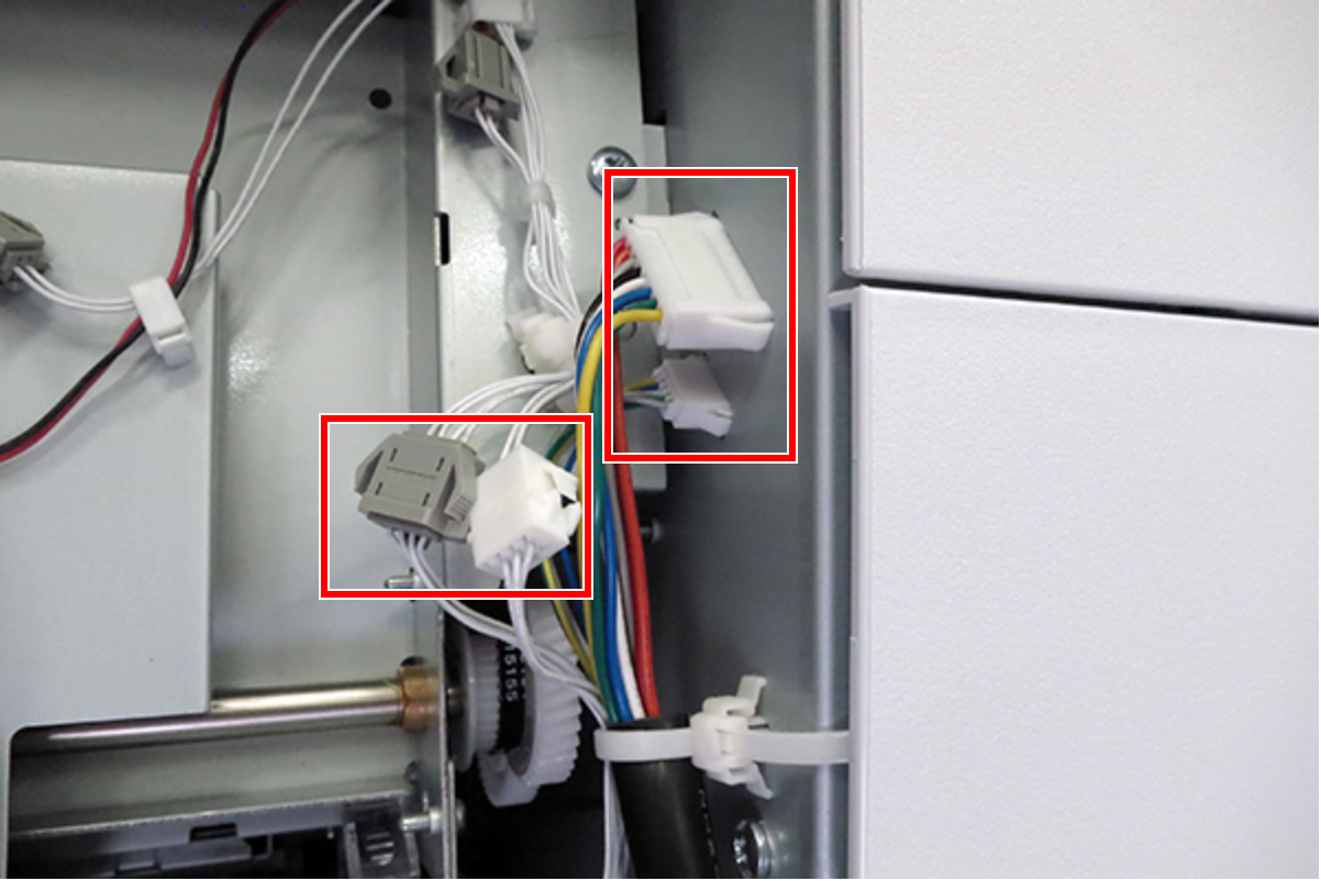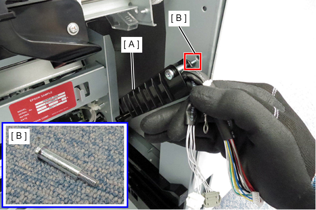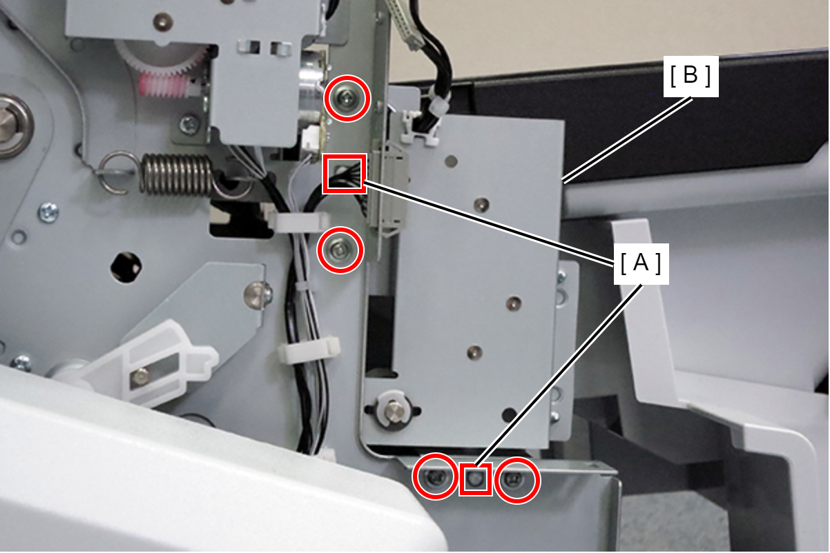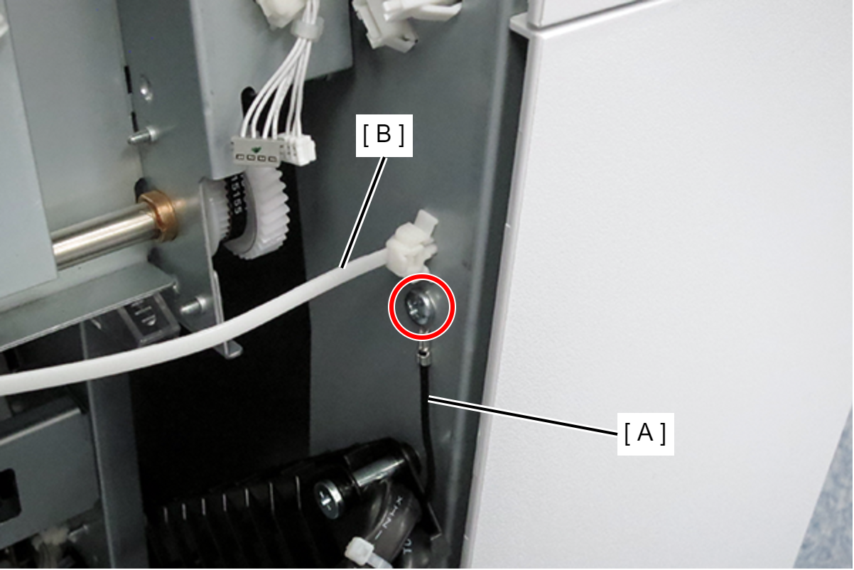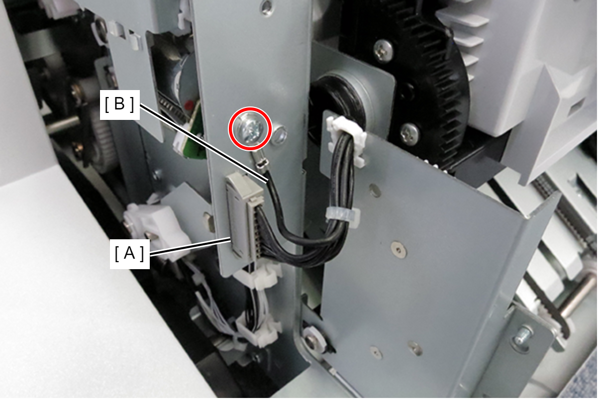 - 将鞍式装订托盘单元的电缆连接到连接器(A),并用1颗螺丝固定地线(B)。