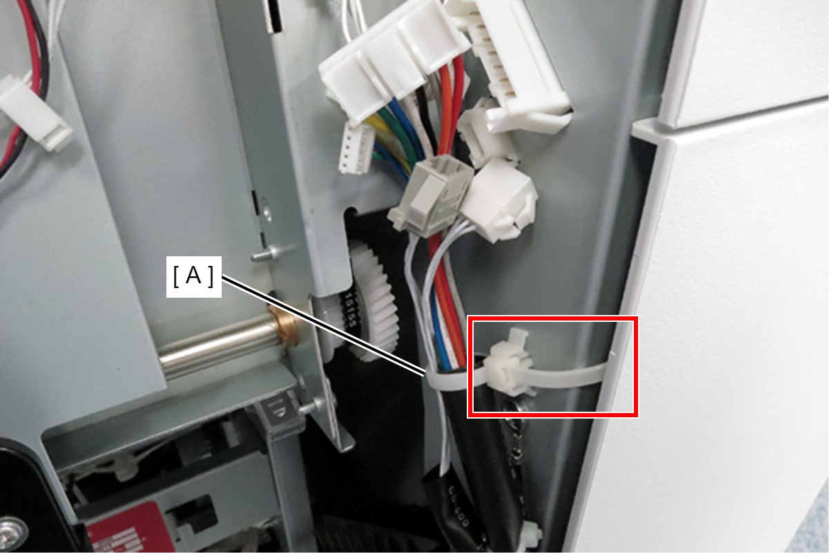 - 用扎带(A)捆扎电缆,将扎带的多余长度插入盖与框架之间的空隙。