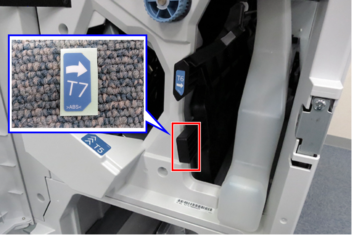 插入鞍式装订传输单元(B)并穿过卡纸释放杆(A)。