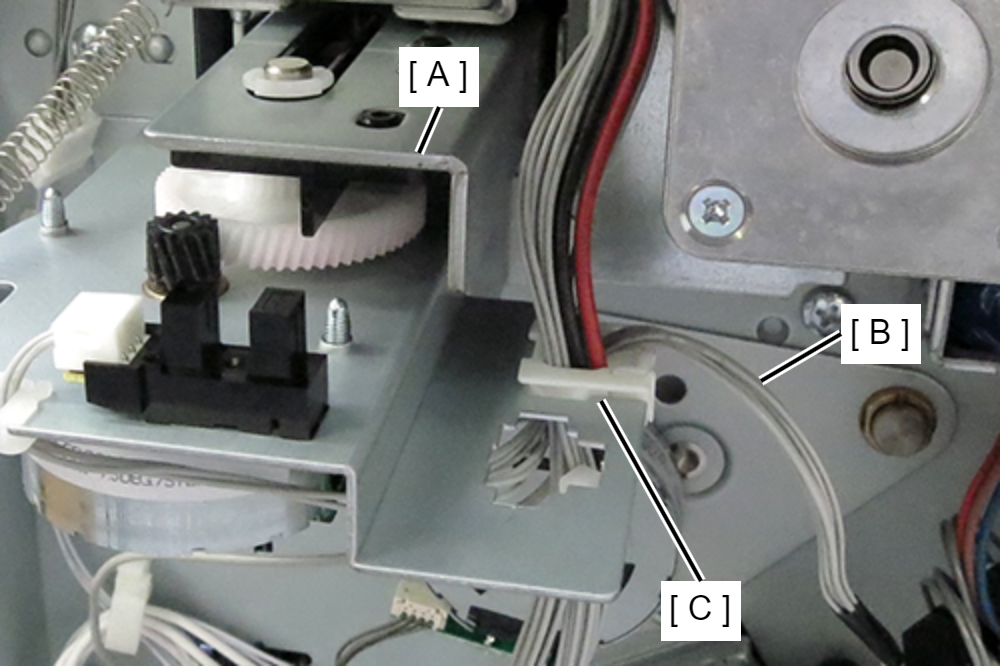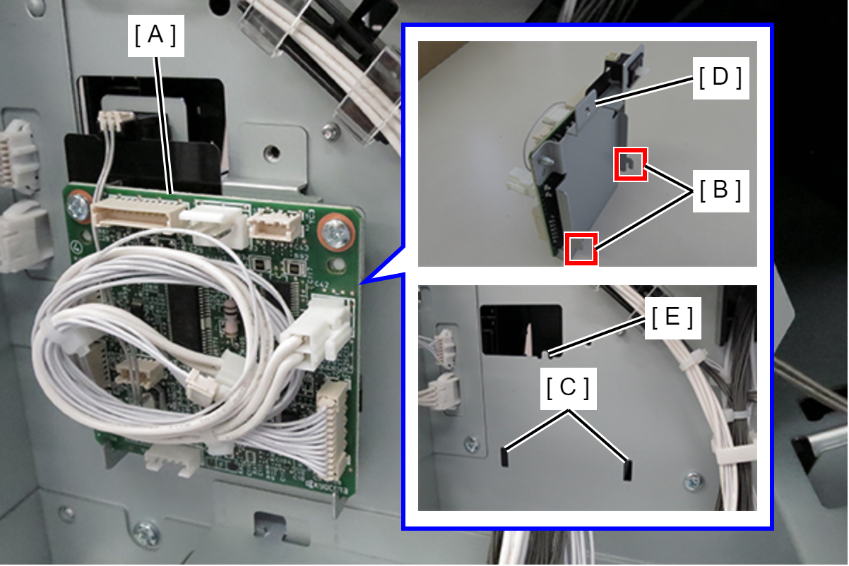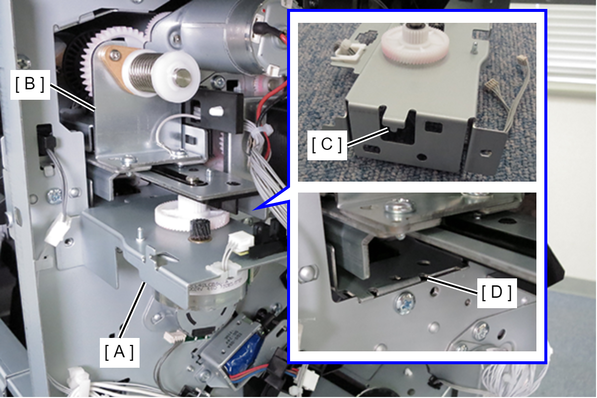 - 提起打孔单元(B)并与电机单元(A)一起插入,在穿孔位置使其降低,然后将电机单元的卡钩(C)装在框架的孔(D)中。