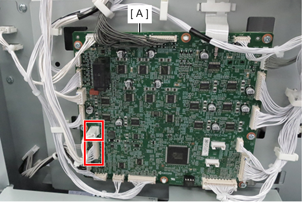 - 将2根打孔板电缆连接到装订器主板(A)连接器。