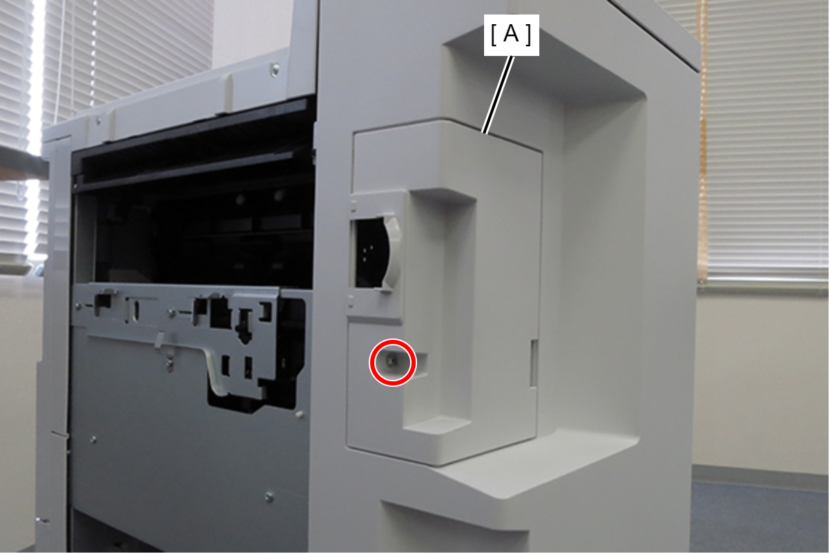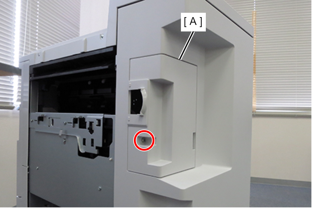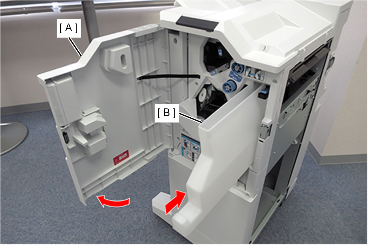 - 打开前盖(A)并插入打孔废屑盒(B)。