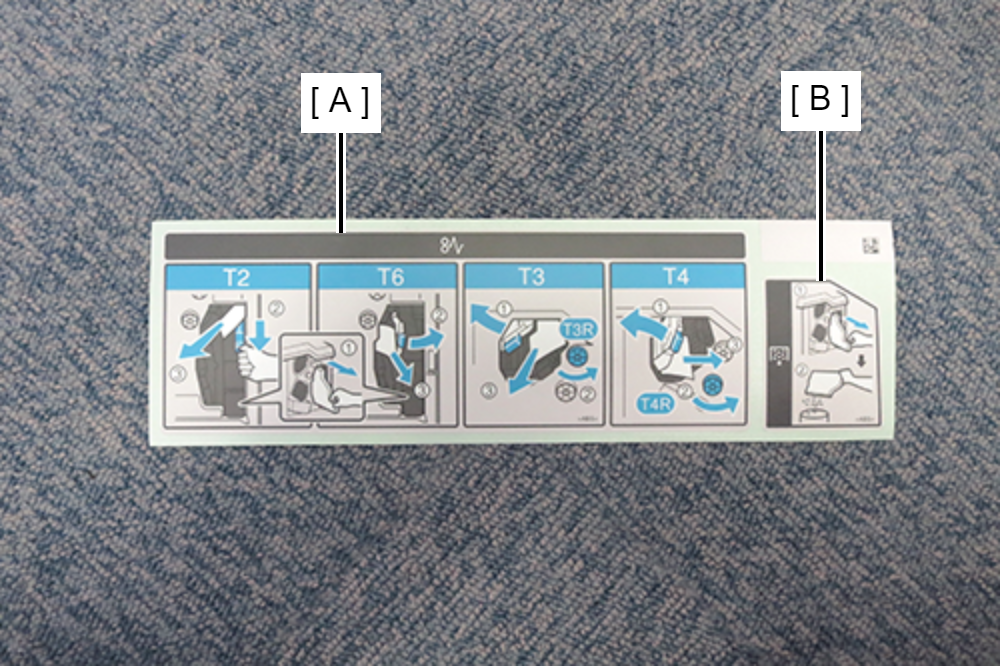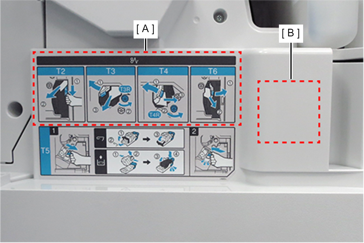 - 把附带项目中的标签(A)和(B)贴在如图所示位置,然后关闭前盖。