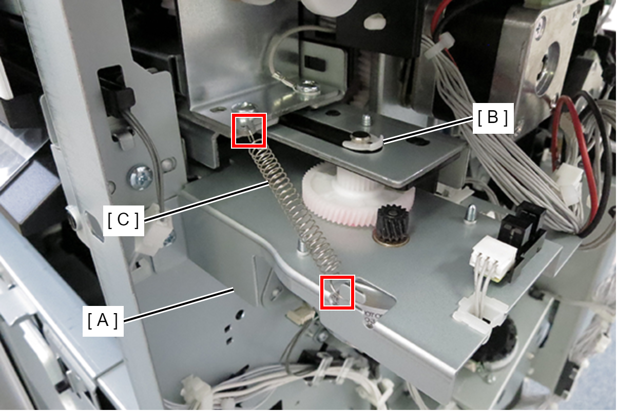 - 将止动环(B)安装到电机单元(A)的轴,然后将弹簧(C)安装到打孔单元和电机单元的卡钩。