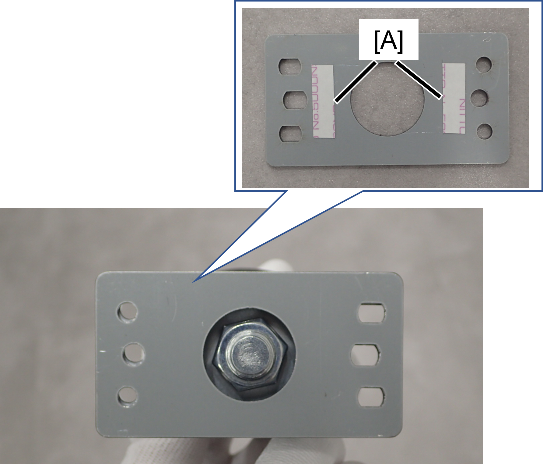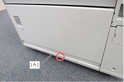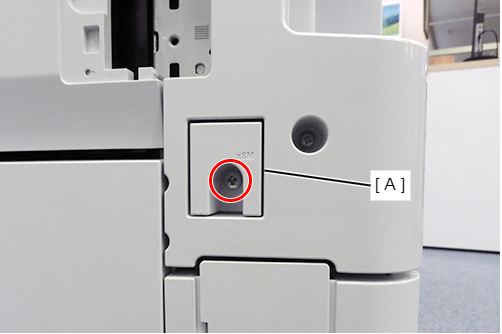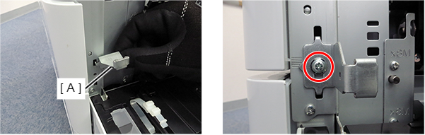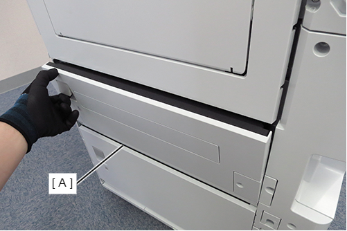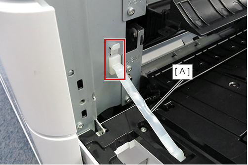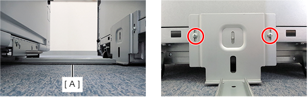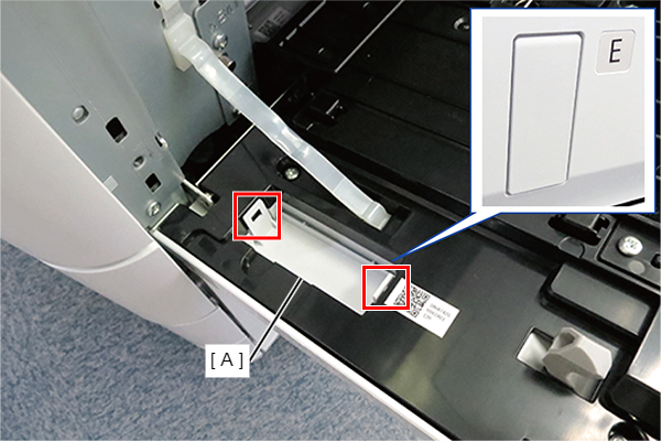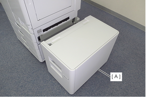 - 根据前侧和后侧的高度差,将定位销中附带的垫片(A)放置在大容量进纸器上。