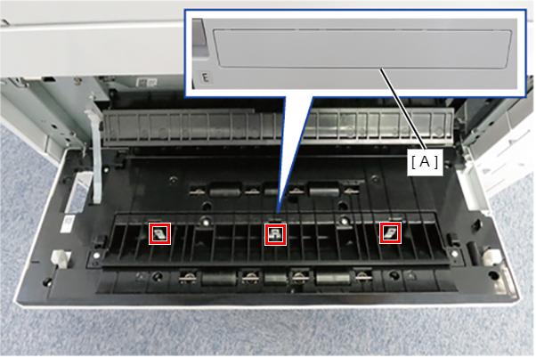 - 释放3个卡钩,拆下进纸槽盖(A)。