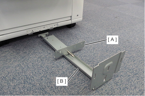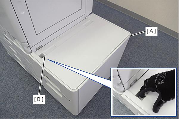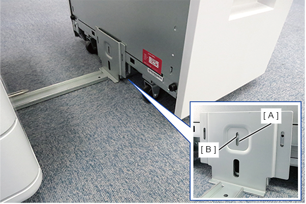 - 把大容量进纸单元移到主机右侧,将大容量进纸单元的定位销(B)对齐滑动导轨的定位孔(A)。