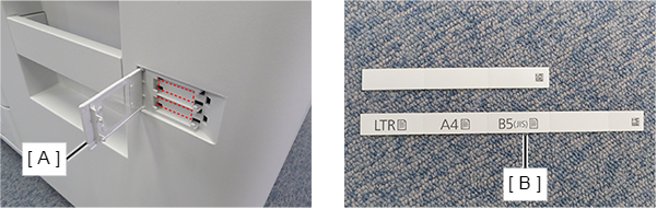 - 打开大容量进纸器的纸盖(A),折叠并粘贴纸张大小标签(B)。