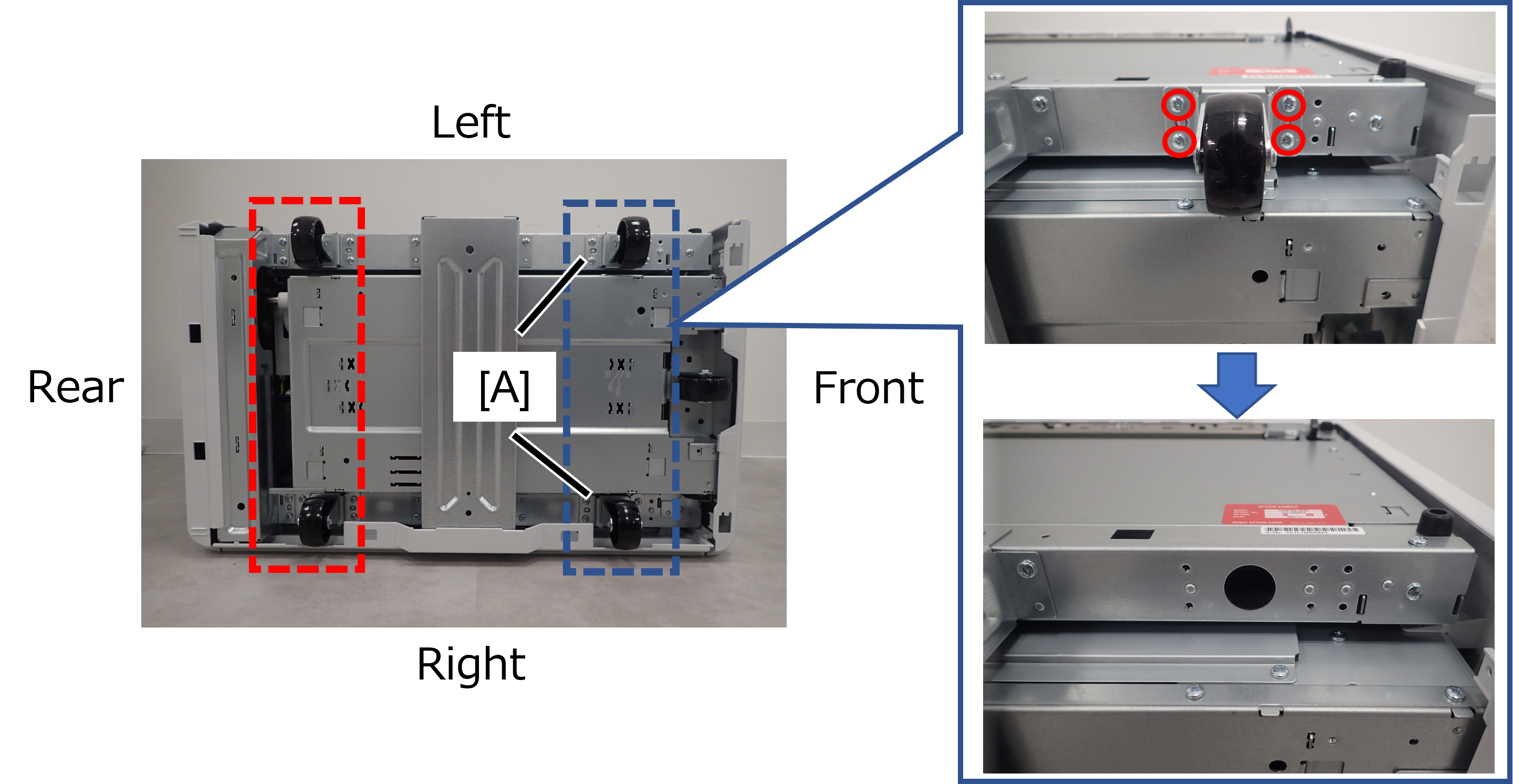 如下图示例所示,被蓝色虚线圈起来的两个脚轮(A)处于下侧。
