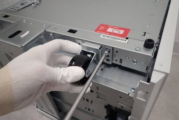 - 用附带的螺丝(M4x12)固定左、右脚轮,中间加上垫片。