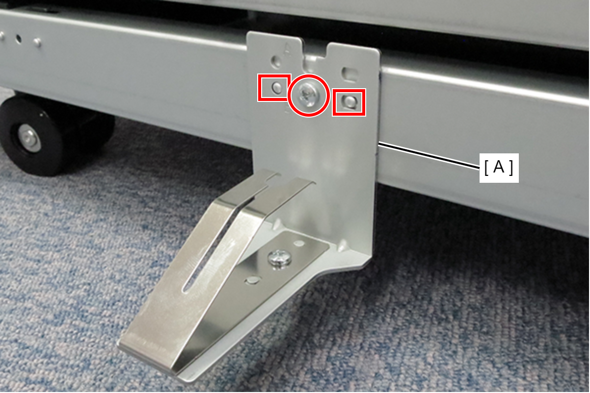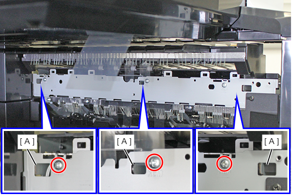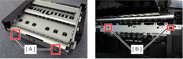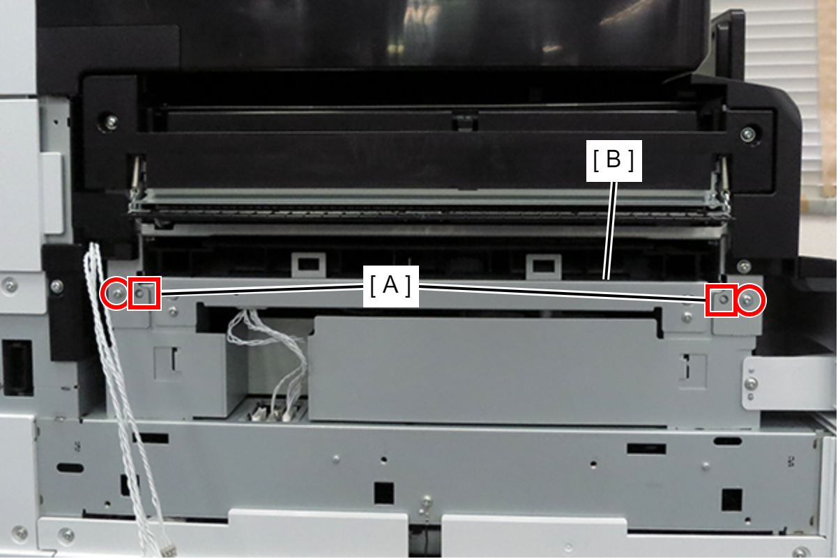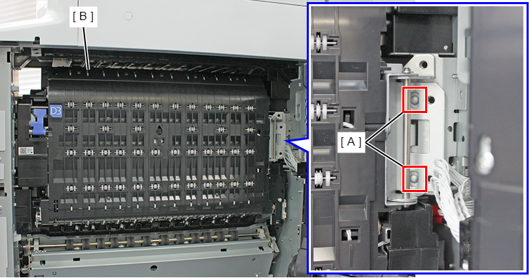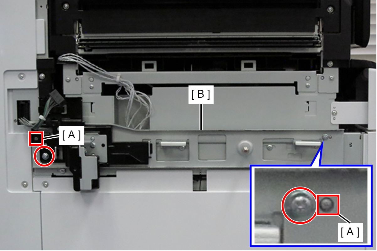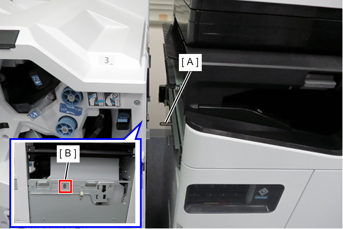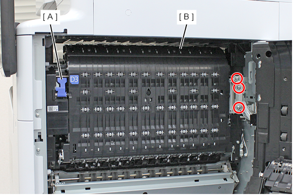 - 检查落地式桥接单元B的框架是否从出纸侧的3个孔(A)中突出,然后拧紧3颗螺丝。