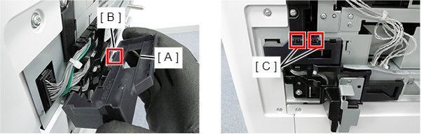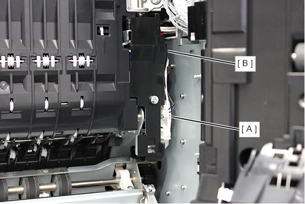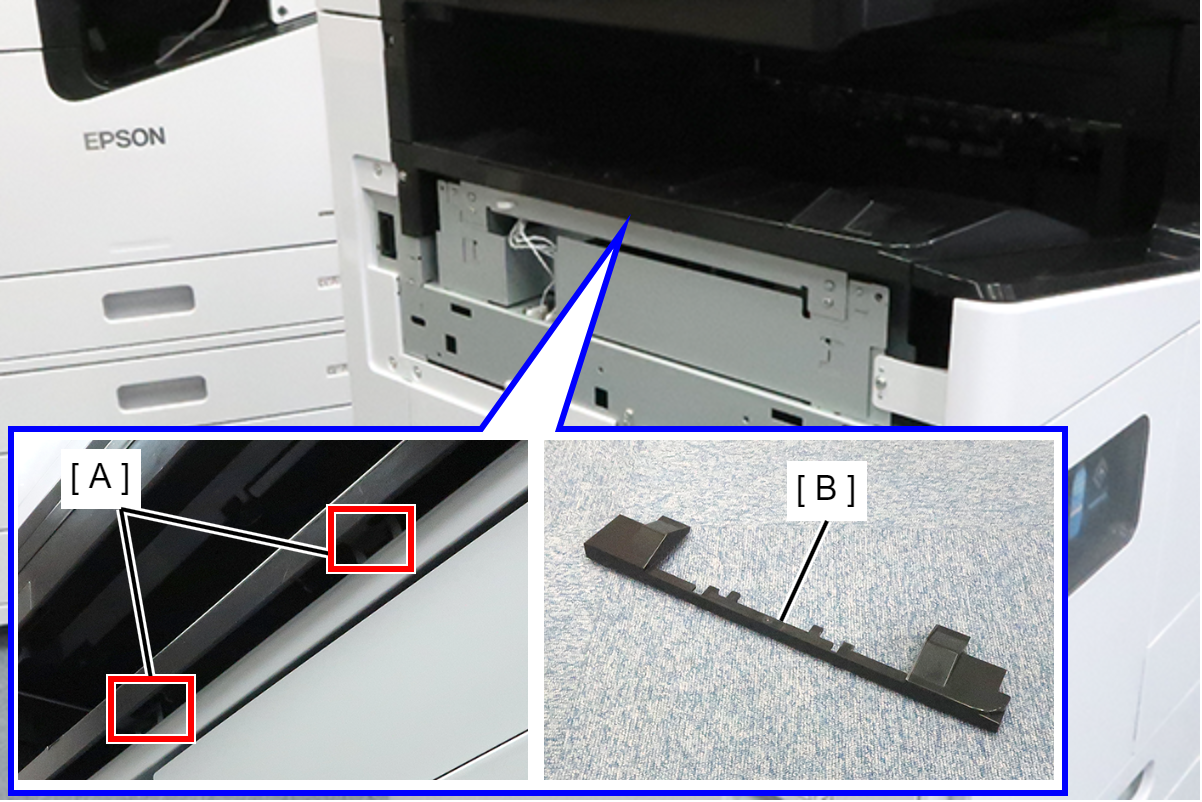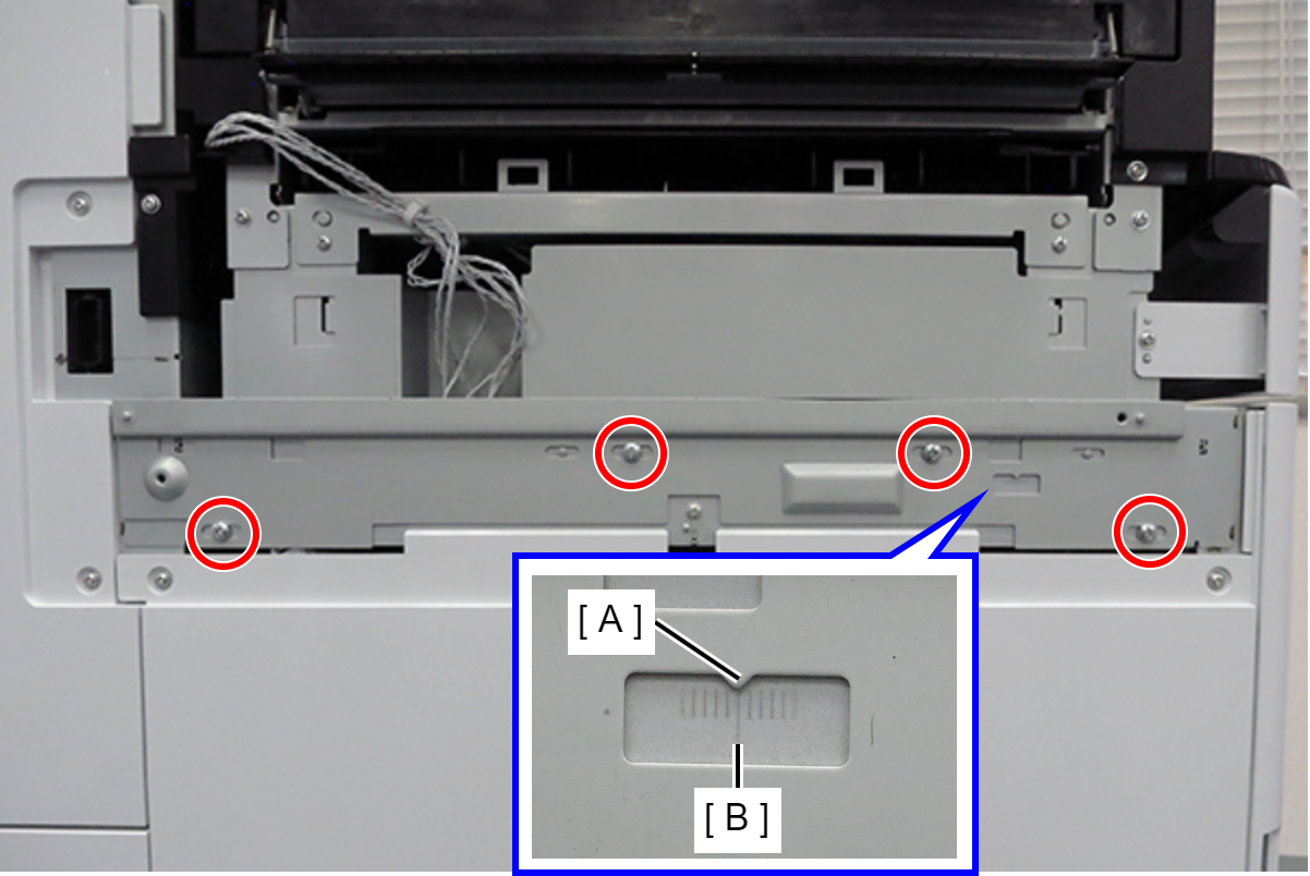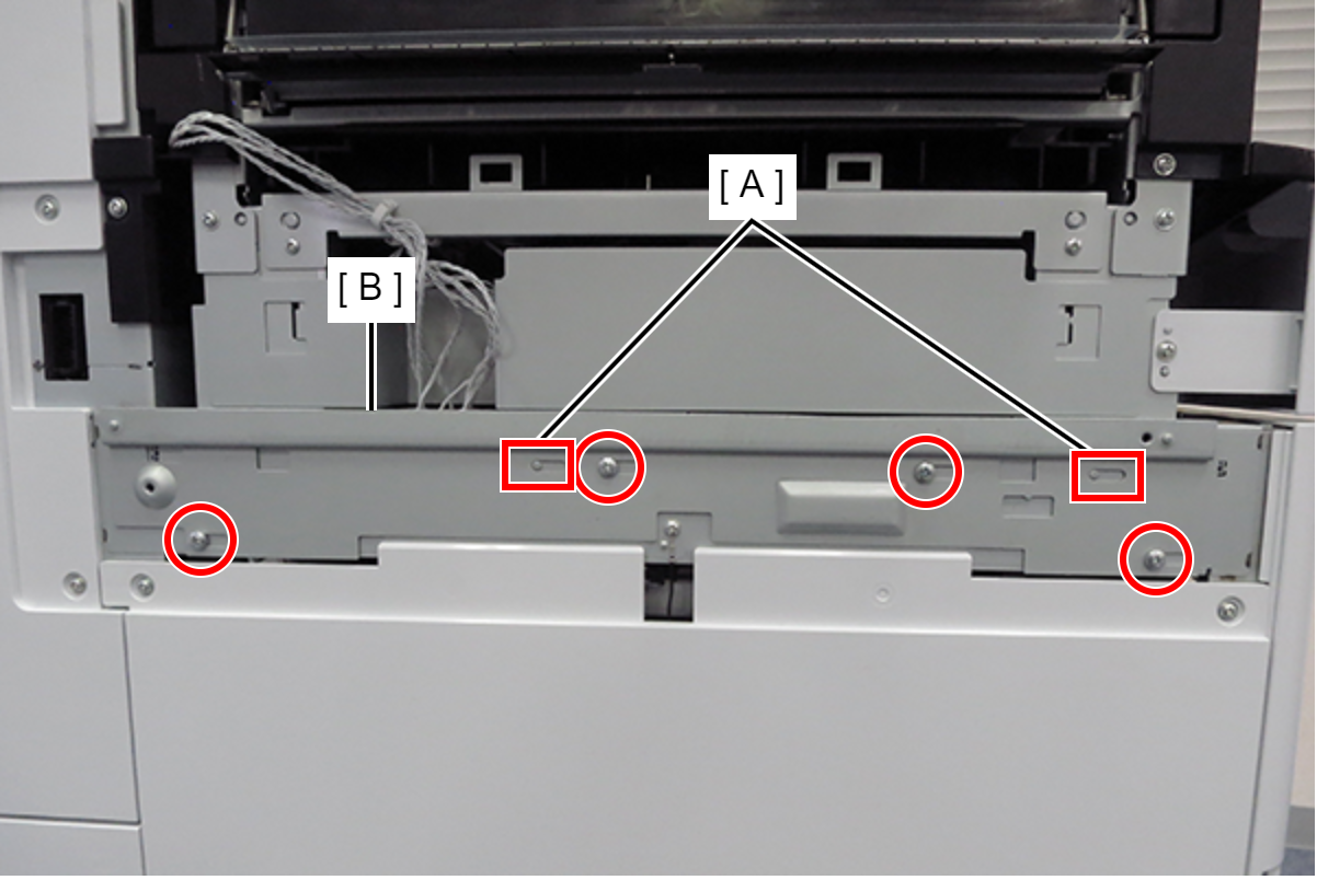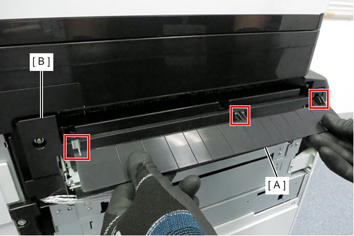- 检查落地式桥接单元B的框架是否从出纸侧的3个孔(A)中突出,然后拧紧3颗螺丝。