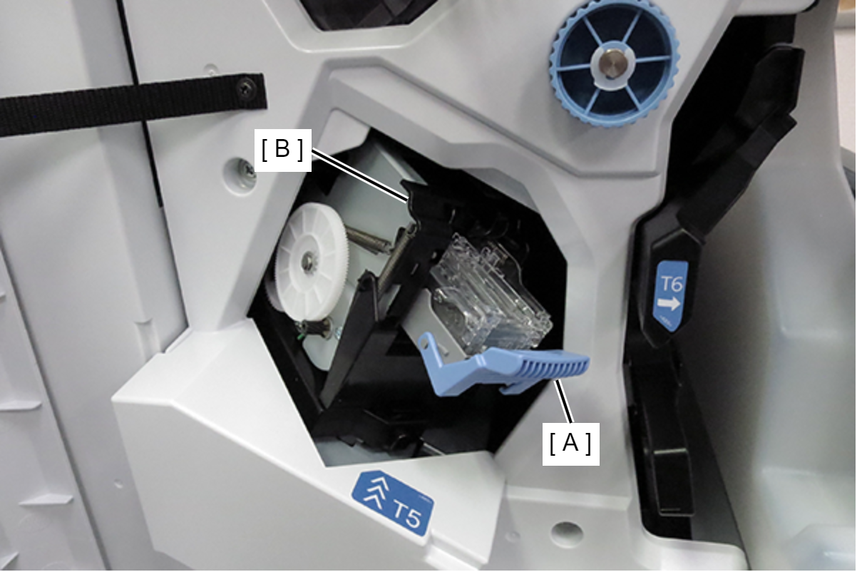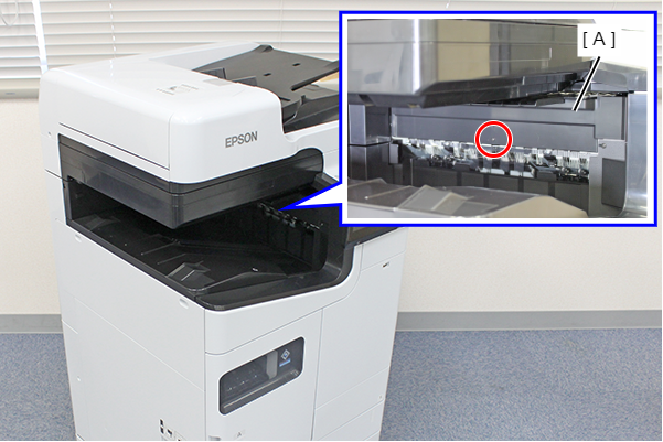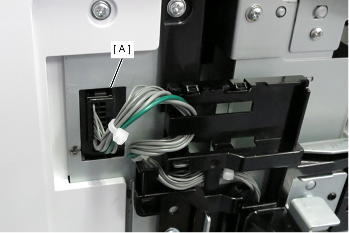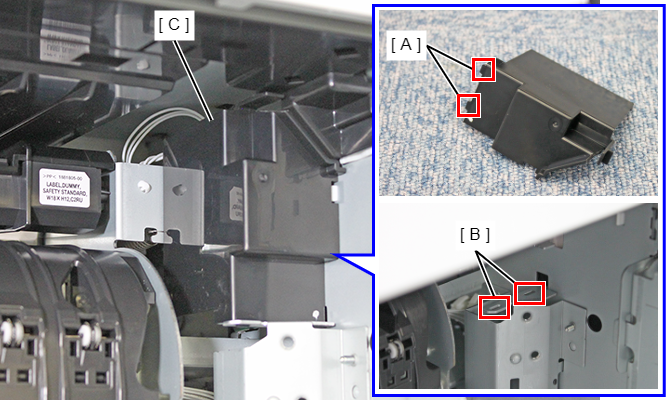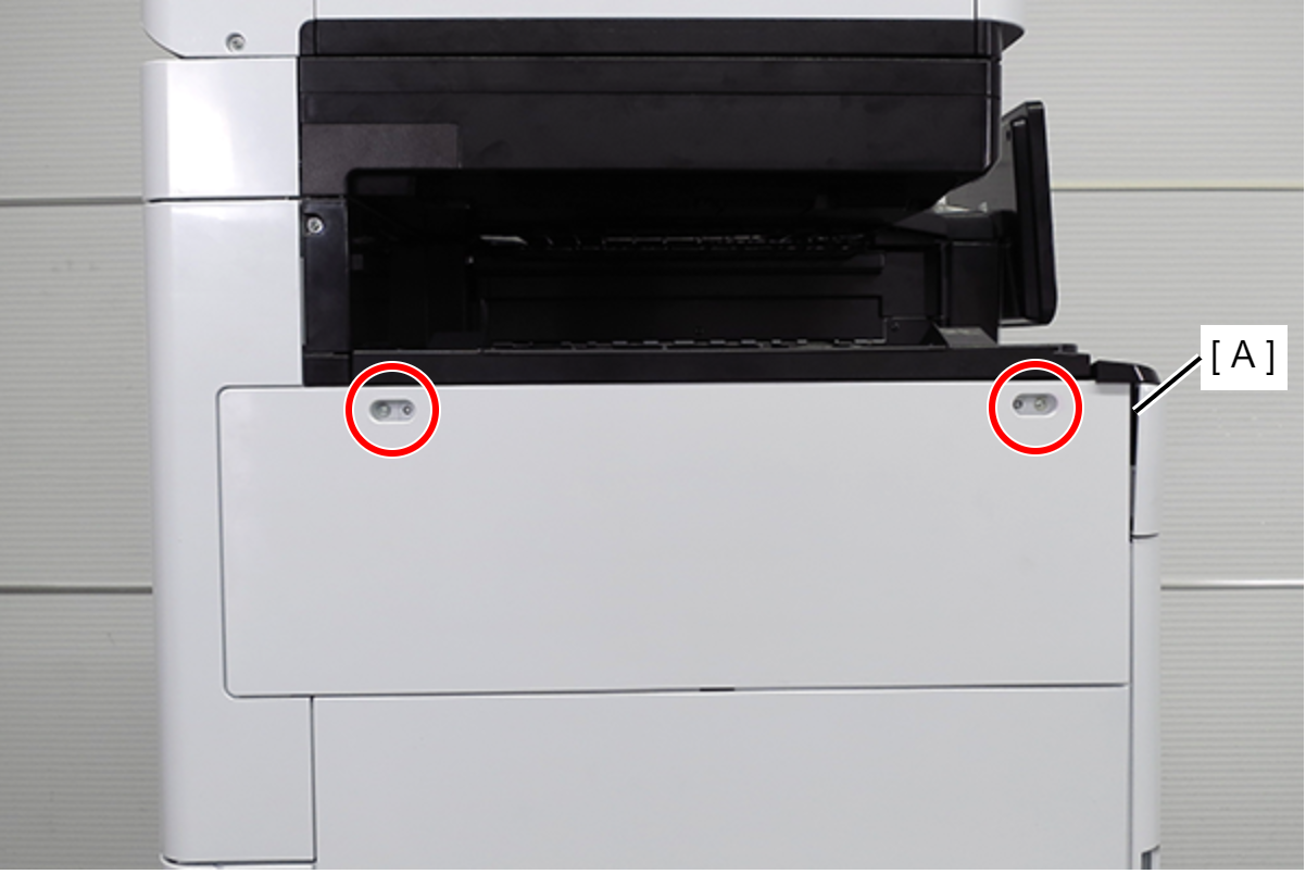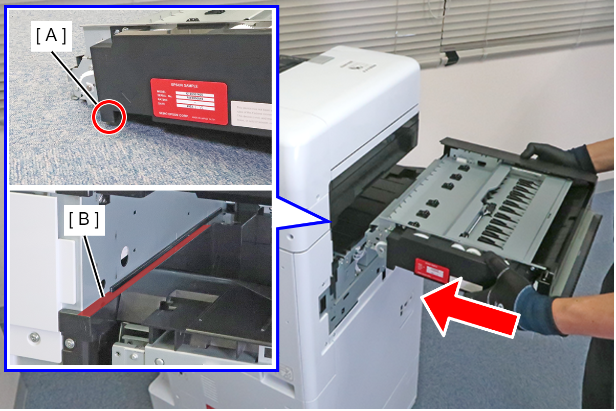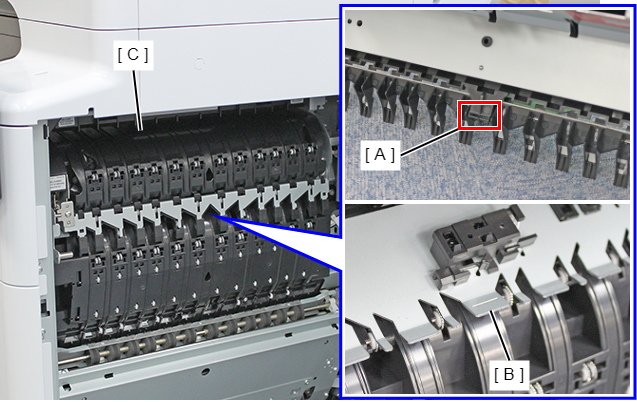 - 检查落地式桥接单元B的框架是否从出纸侧的3个孔(A)中突出,然后拧紧3颗螺丝。