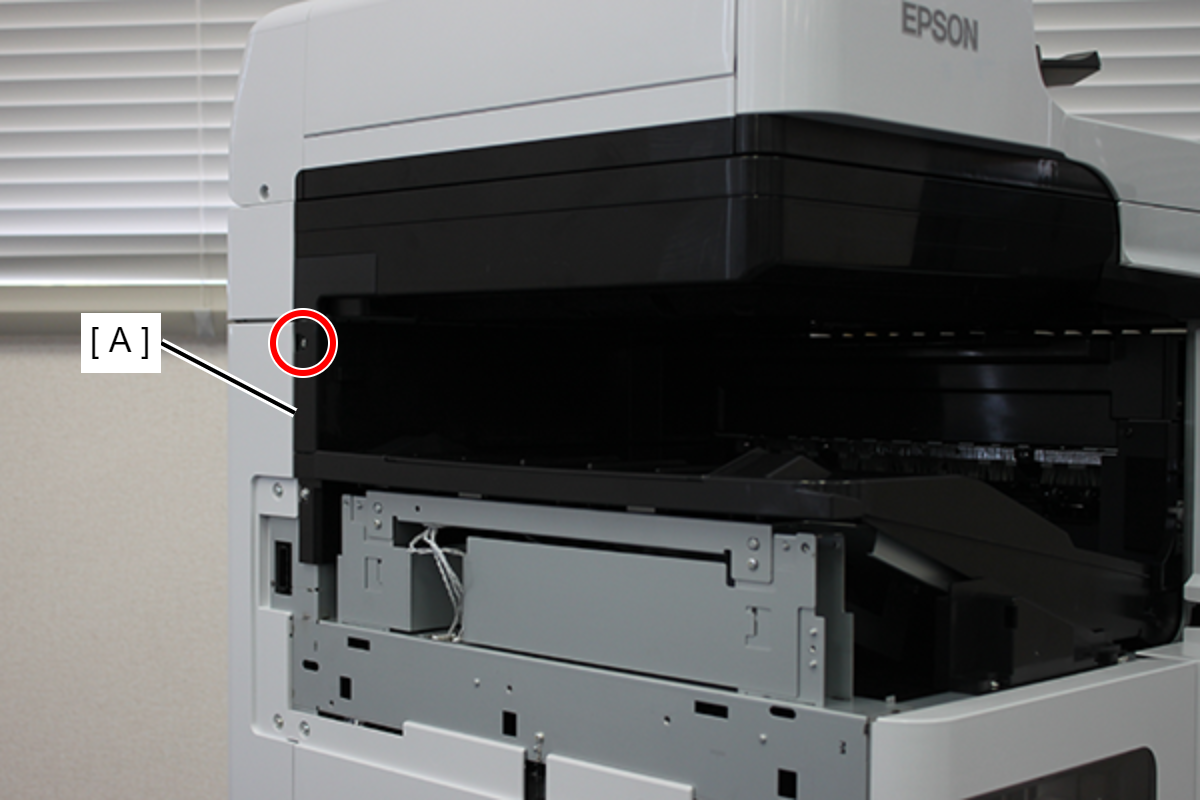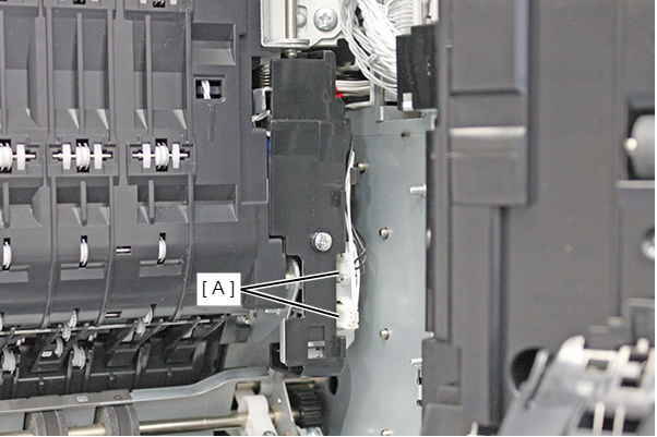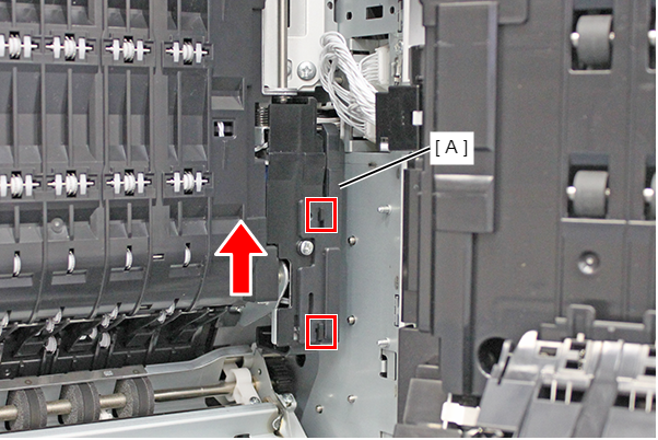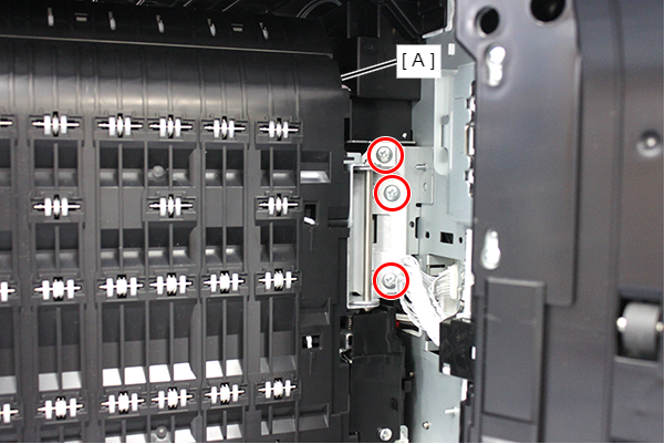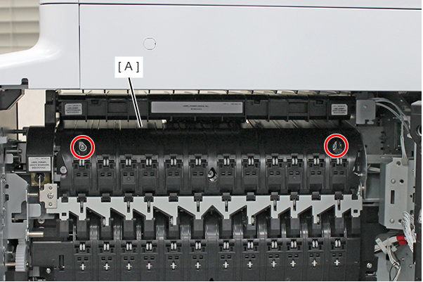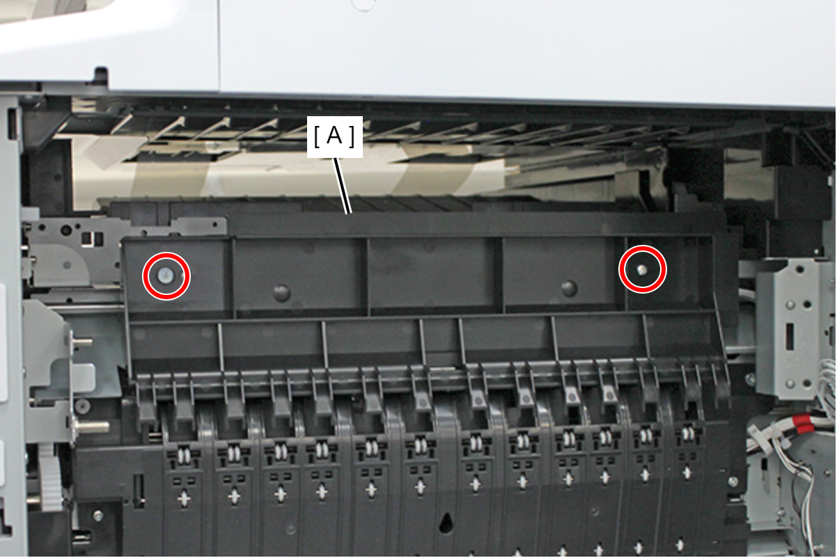 - 拆下2颗螺丝,然后拆下出纸导纸轨(A)。