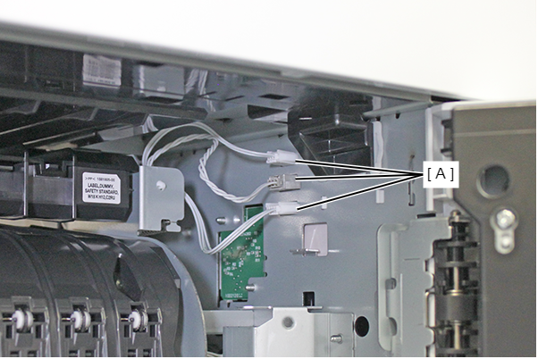 - 将连接板的电缆穿过卡钩,连接到主机上的连接器(A)。