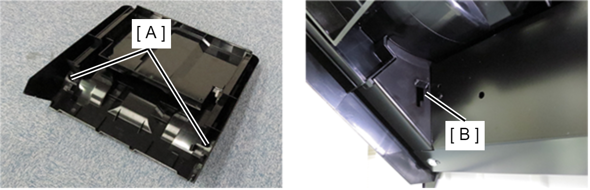 - 释放2个卡钩(A),拆下FD收纸器前端盖(B)。