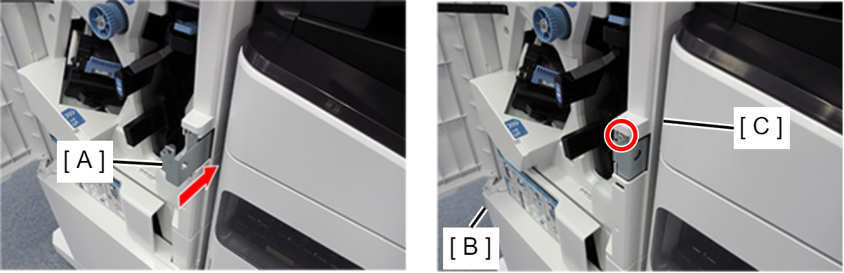 - 推入滑动锁(A)并拧紧螺丝,将落地式装订器(B)固定到主机(C)。