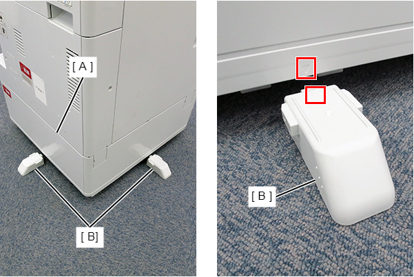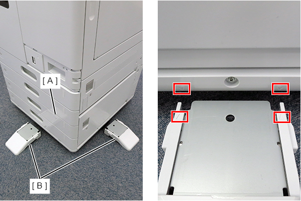 - 将稳定器B (B)上的箭头标记对齐新增纸盒(A)背面和左侧底部的箭头标记。