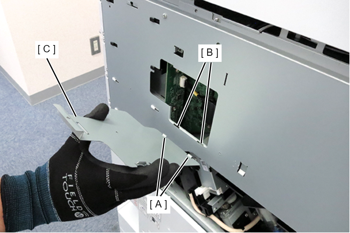 - 将屏蔽板的2个卡钩(A)钩在电路板箱的2个孔(B)中,然后安装屏蔽板(C)。