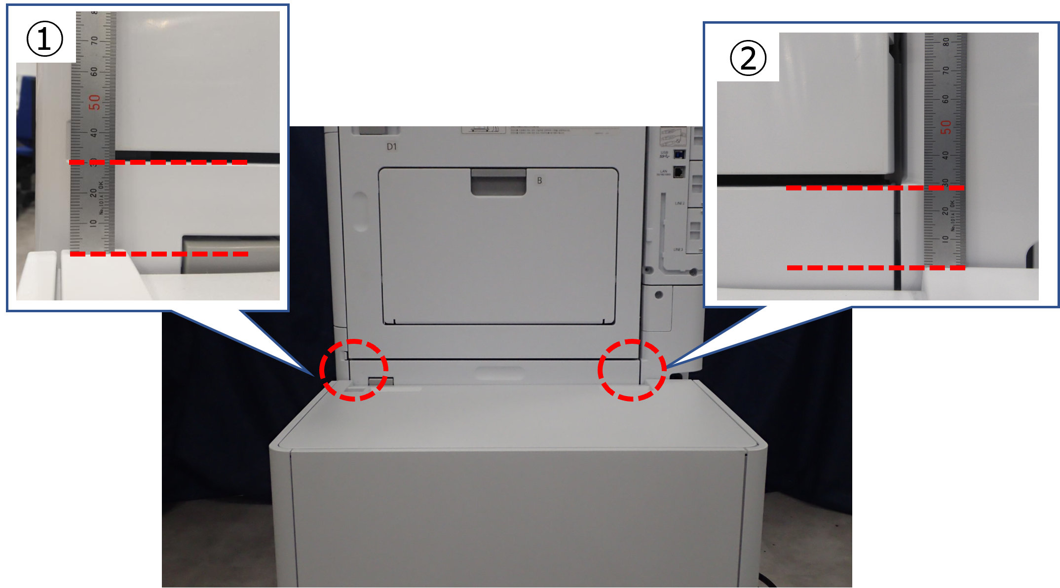 根据地面材料的状况(例如具有高缓冲属性的地面材料),主机可能会下沉,并且大容量进纸器和主机的纸张路径之间的位置关系可能会超出规格。这可能会导致侧对位错位、卡纸等进纸故障。